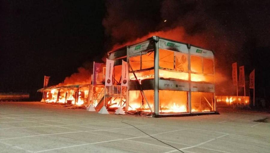 In perhaps the most bizarre incident in motorcycling racing, an entire grid has been destroyed in a pit paddock inferno. All 18 machines developed for this year’s inaugural MotoE World…