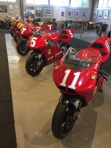 Five of the Cagivas on display 11 John Kocinski, 5 Doug Chandler, 7 Eddie Lawson, I Marco Papa, 18 Randy Mamola copy