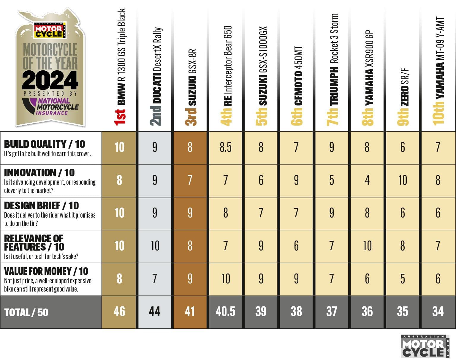Welcome to AMCN’s Motorcycle of the Year for 2024, presented by National Motorcycle Insurance – the most anticipated test for readers, staff and the industry alike! This year AMCN has called upon the expertise of its dedicated fleet of bike testers, here in Australia and overseas, to determine the single greatest all-round motorcycle of the year – as judged against our tried and tested criteria. We’ve selected a cross-section of incredible bikes that show the current state of the industry and the huge choice Australian riders have at their disposal. After testing all of the major new bikes over the past 12 months, we’ve narrowed our choice down to the 10 you will devour over the following pages.