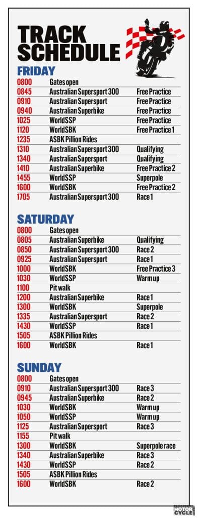 As AMCN went to press, Phillip Island advised the schedule of what to expect wouldn’t be released until just before the event.