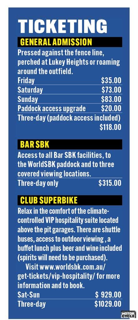 Tickets at this year’s round range from $35 for a Friday-only general admission pass through to $1029 for a three-day pass for Club Superbike, a Pit Roof VIP Hospitality package. The options are listed below.