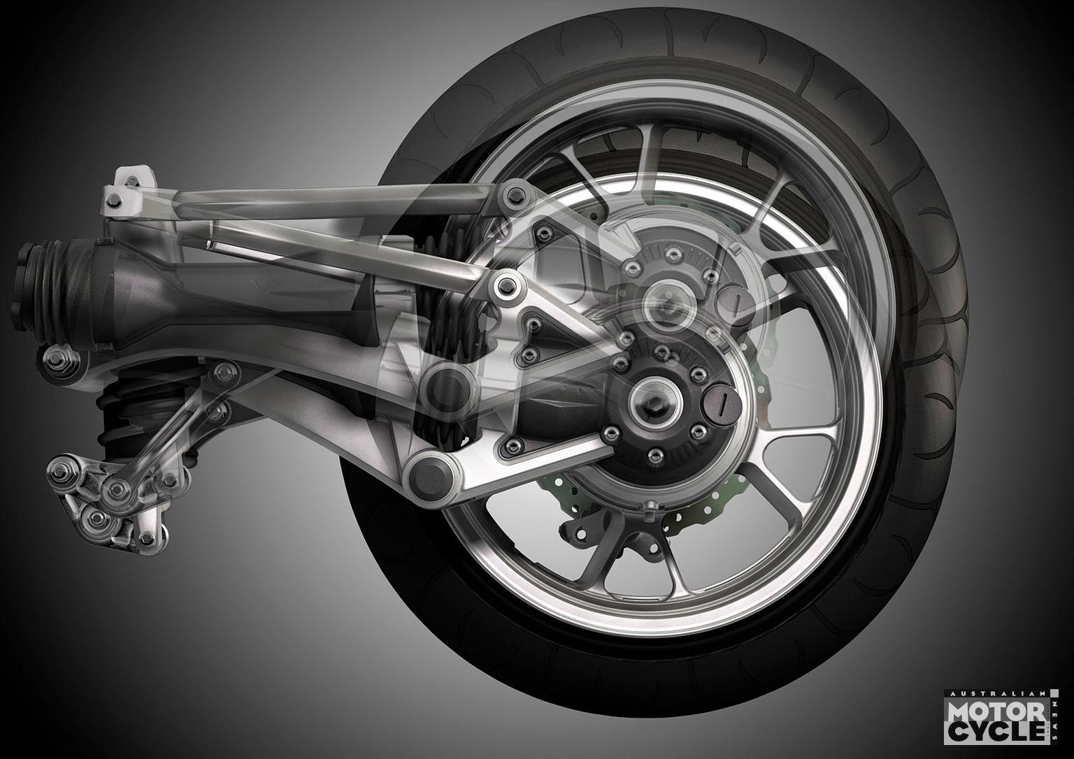 The GTR’s Tetra-Lever rear suspension counteracts the torque reaction of the shaftdrive