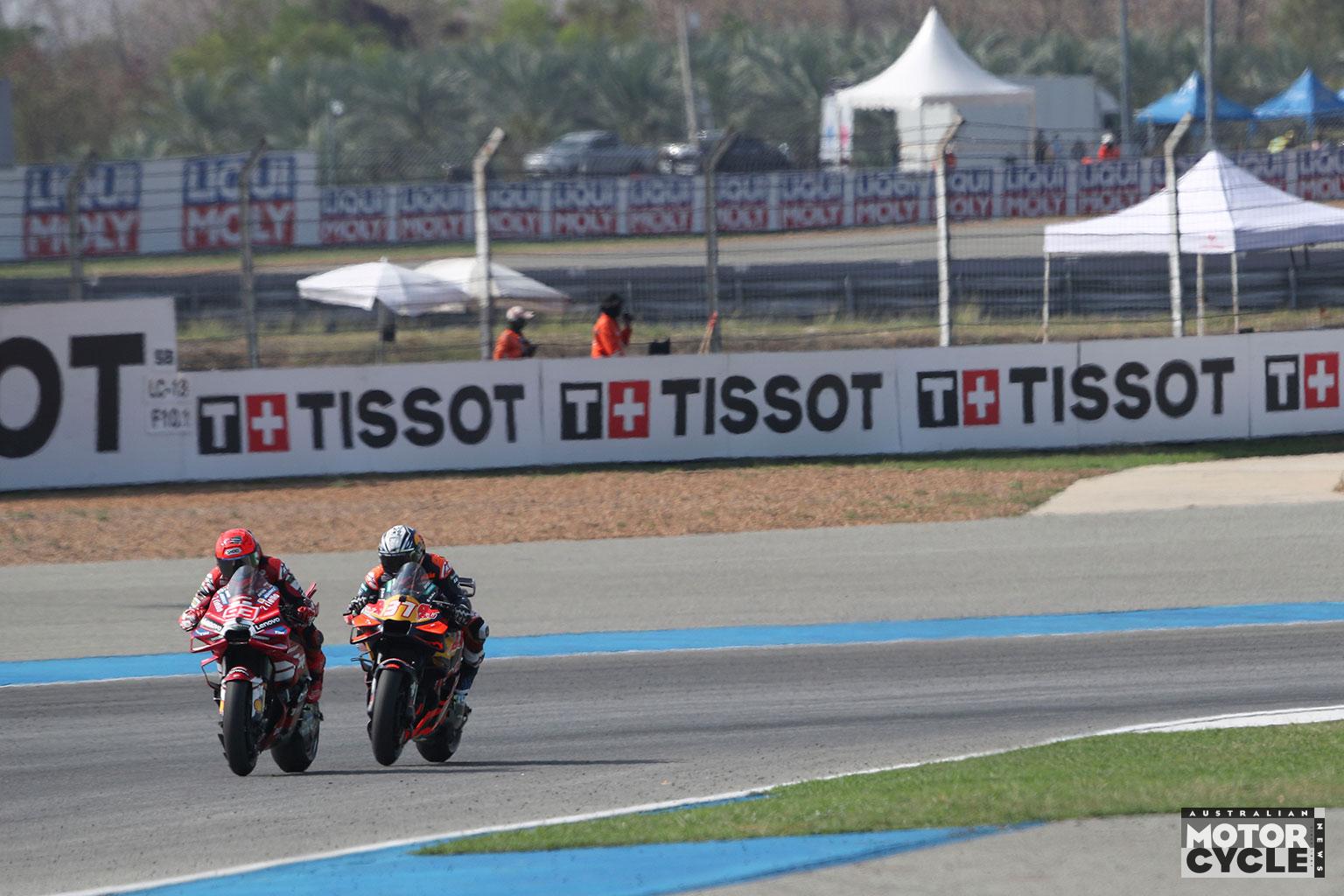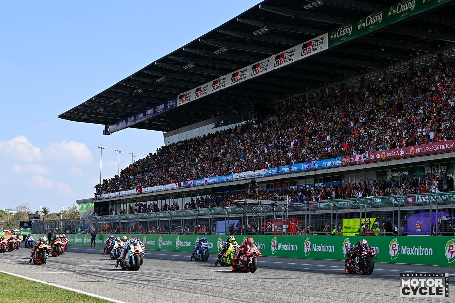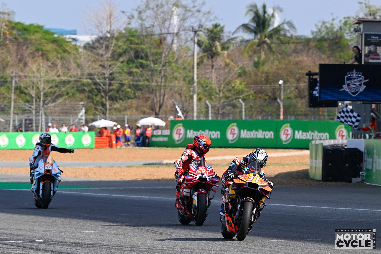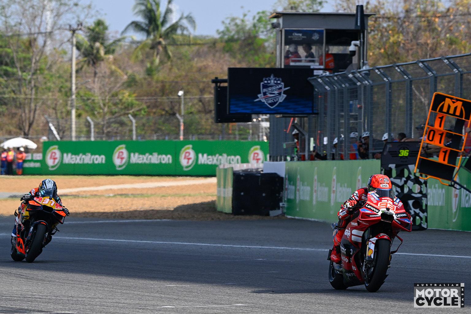 MotoGP’s 2026 season roared into life in Thailand with the field lining up for the first time this year in absolutely stifling conditions, the hottest it’s been all weekend. From P2 on the grid Marc Marquez nailed the launch and led early, as Alex Marquez ran Fabio Di Giannantonio wide and into the run-off in the opening exchanges. The lead then briefly flipped when Marco Bezzecchi attacked through, only for Marquez to strike back at Turn 12 as the front group started trading blows immediately.