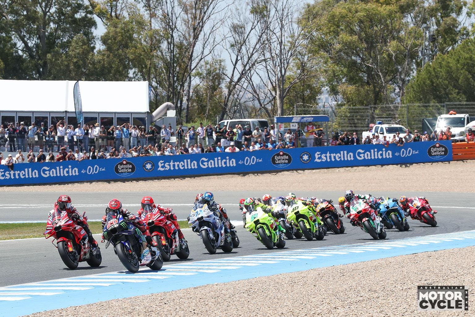 The drama started early, with Marc Marquez seemingly struggling to engage the holeshot device as he lined up on the grid. A scrappy launch into Turn 1 followed, though he still managed to slot into third behind polesitter Fabio Quartararo and brother Alex. As the field piled into Turn 6 ,Alex Marquez missed his breaking marker, barely avoiding a collision with Marc and Pecco Bagnaia, though he was able to pull his Gresini Ducati up in time to avoid the gravel trap and sweep back into 4th position.