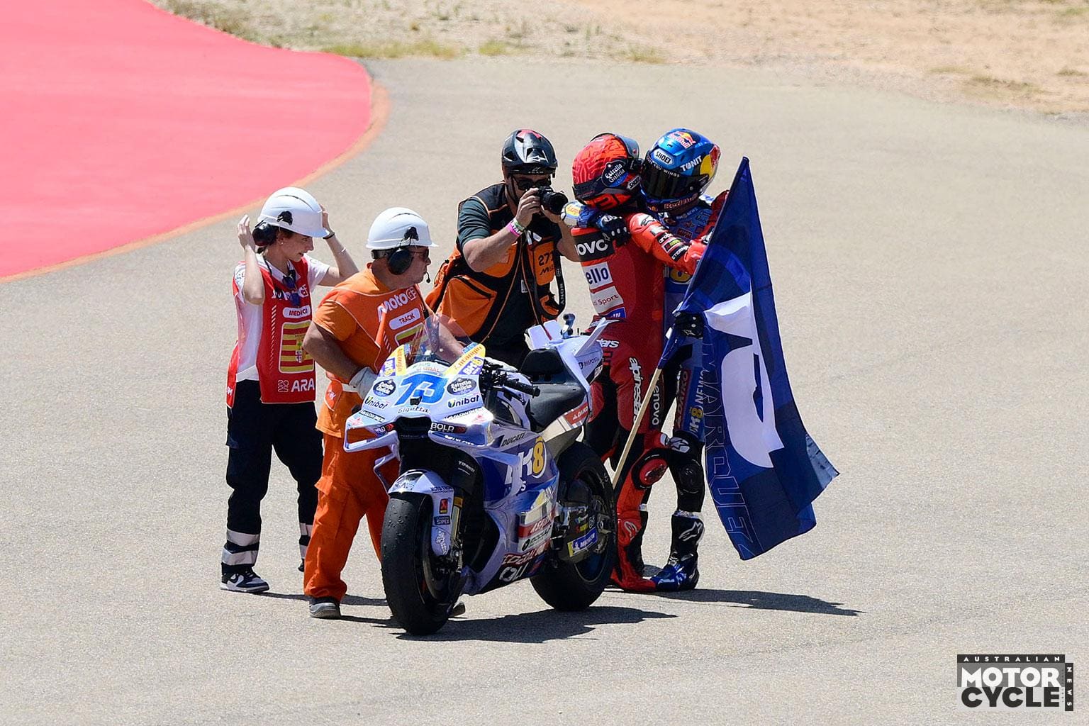 The interest lay behind. While his brother was in the midst of his devastating run of fastest laps, Alex Marquez was in the clutches of Bagnaia, Acosta and Binder. By lap 14, half a second separated him and the second factory Ducati. Yet a strong late run saw him eke out a full second on the Italian to claim his fourth double second place of the year.