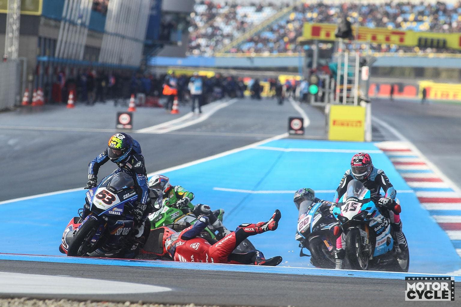 Pole position for Can Oncu (Yamaha bLU cRU Evan Bros Racing) threatened to be translated into another front-running ride, but in a 12-lap opening race (after a big crash and restart shortened it from its planned 18 laps), he would finish third. He was reeled in and passed by winner Bo Bendsneyder (MV Agusta Reparto Corse) and second placed Stefano Manzi (Ten Kate Racing Yamaha).