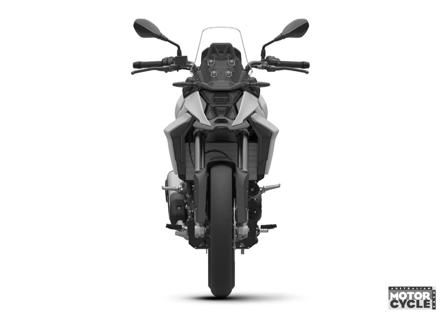 Starting at the front, the changes begin with a subtly reshaped front fender and screen, creating a near-straight line from the top of the screen to the tip of the nose where the show model had a more vertical windshield and longer snout. There’s also a more extensive mudguard hugging the front wheel. Behind the screen, the open-sided black panels below the bars are smaller than the show model’s, and there’s a much smaller bash plate under the engine, and at the rear the exhaust end can is sited lower than the concept’s, while the tail bodywork is reshaped and lacks the tubular steel luggage rack of the show version. Again, an ‘Adventure’ variant might bring some of those elements back once the bike is officially revealed.