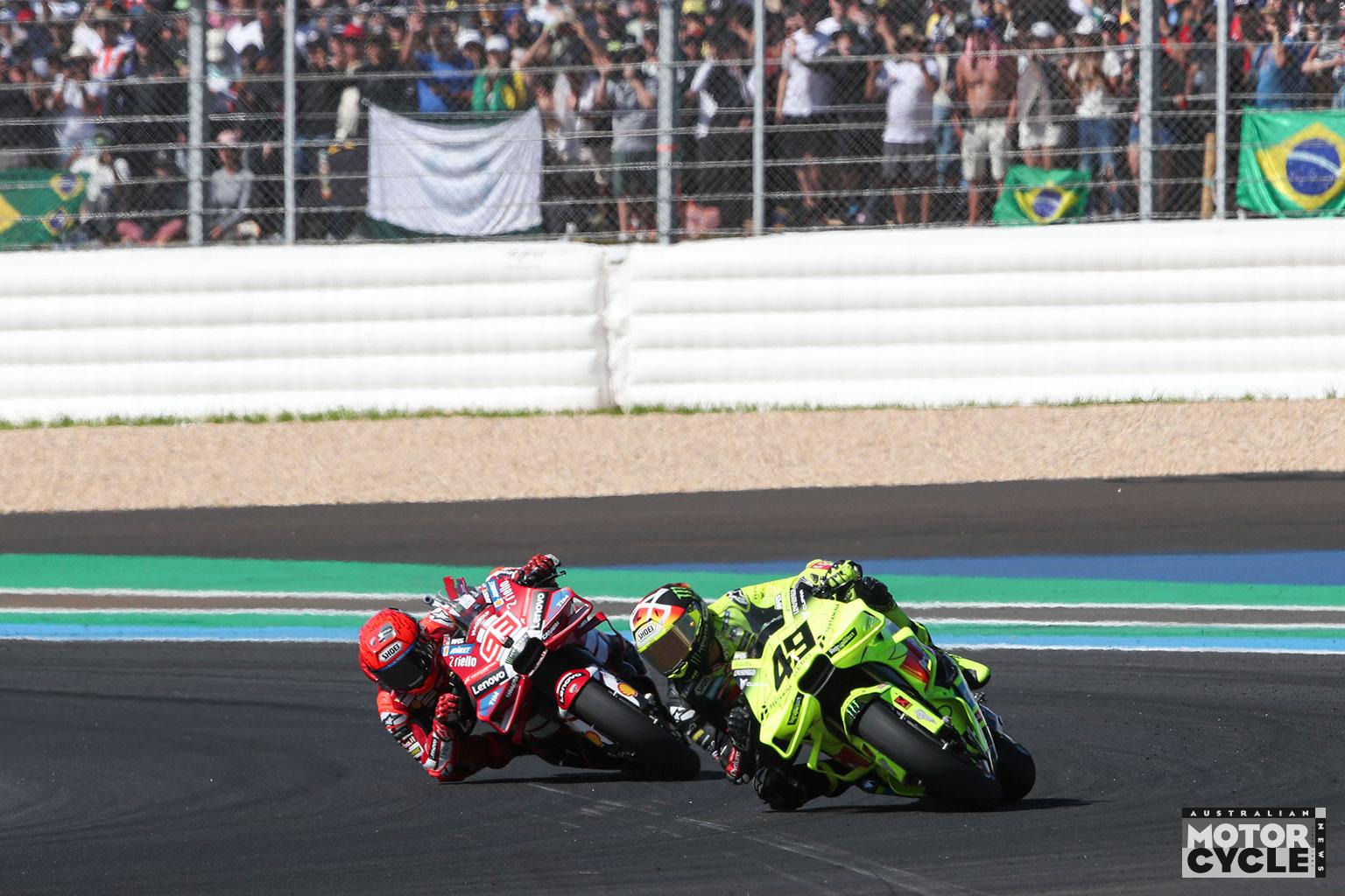 On lap two, Di Giannantonio ran wide at Turn 1, handing Marquez a chance to move ahead. A lap later Acosta attacked Martin into Turn 12 to take fourth, while Di Giannantonio began prodding for a way past Marquez, only to find the door repeatedly shut. Up front, Bezzecchi was already settling into an ominously fast rhythm at the head of the field.