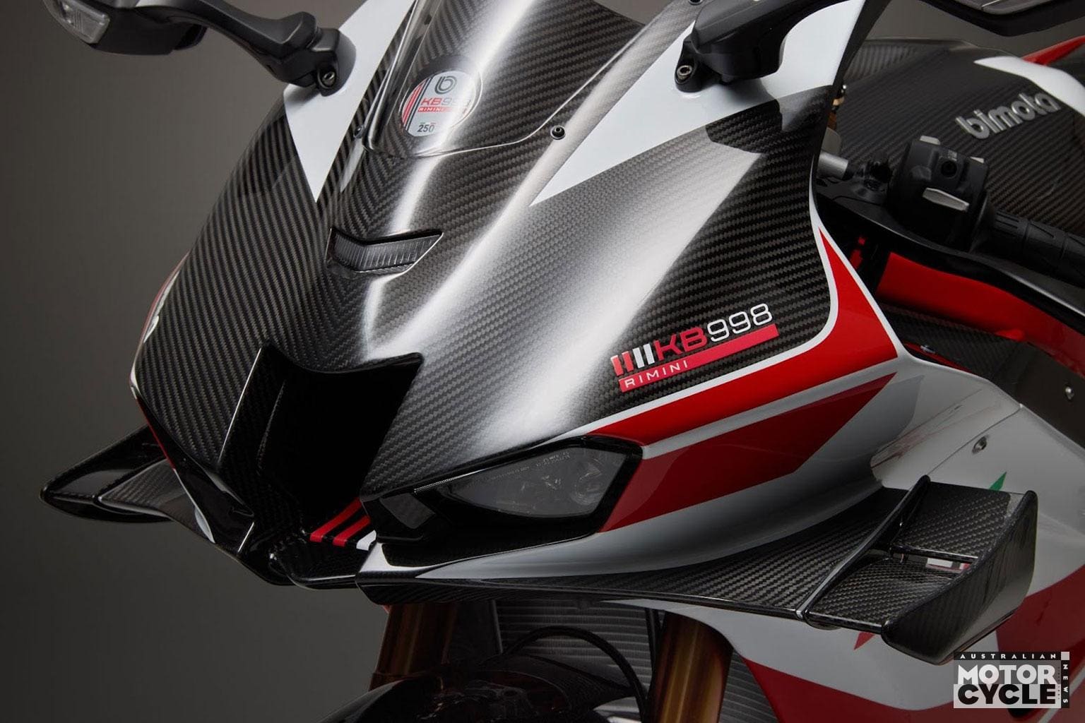 Showa suspension and Brembo brakes, allied to a dry weight of 195kg, are on a par with expectations in this category, but less familiar is the KB998’s aero, claimed to include winglets that are “able to automatically maintain the optimal angle at all times” – implying they’re electronically adjustable even when the bike is moving to maximise downforce when it’s needed and reduce drag when it’s not.