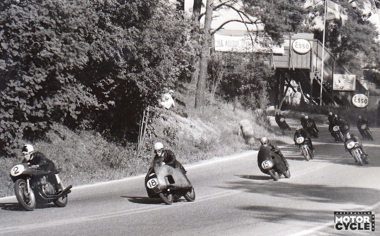 The circuit, twisting through hills and fields, is heritage listed. In the 1950s, locals built viewing platforms around their house chimneys and the Larrson family rented its garage to Campbell. Others mention Campbell grinding a valve for his Norton pre-race at Hannson, a workshop in Station St, and Keith’s 350 engine failing at the end of the 1956 Grand Prix.