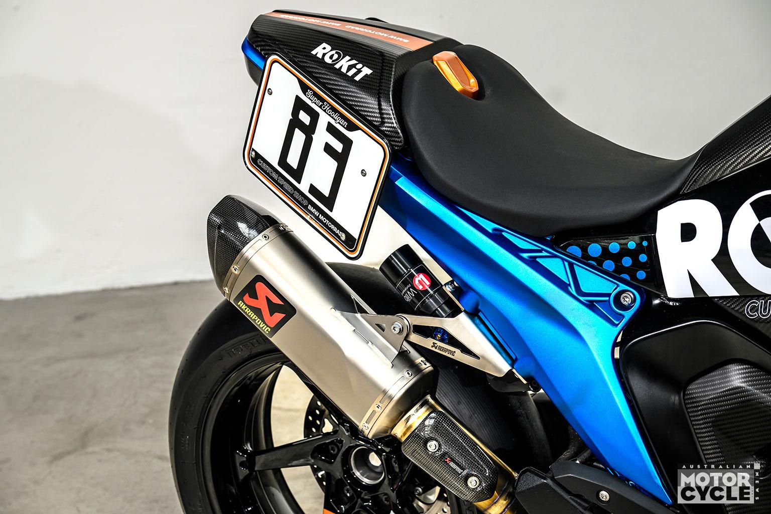 The most direct nod to McLaughlin’s Daytona victory is the bike’s racing number, 83, and paint details that reference period BMW R 90 S colors, applied to elements such as the front fender and tank side panels. Additional blue accents—matching the hue used on BMW M 1000 RR brake calipers—appear on the aluminum rear frame and fork components, extending to the rear shock spring.