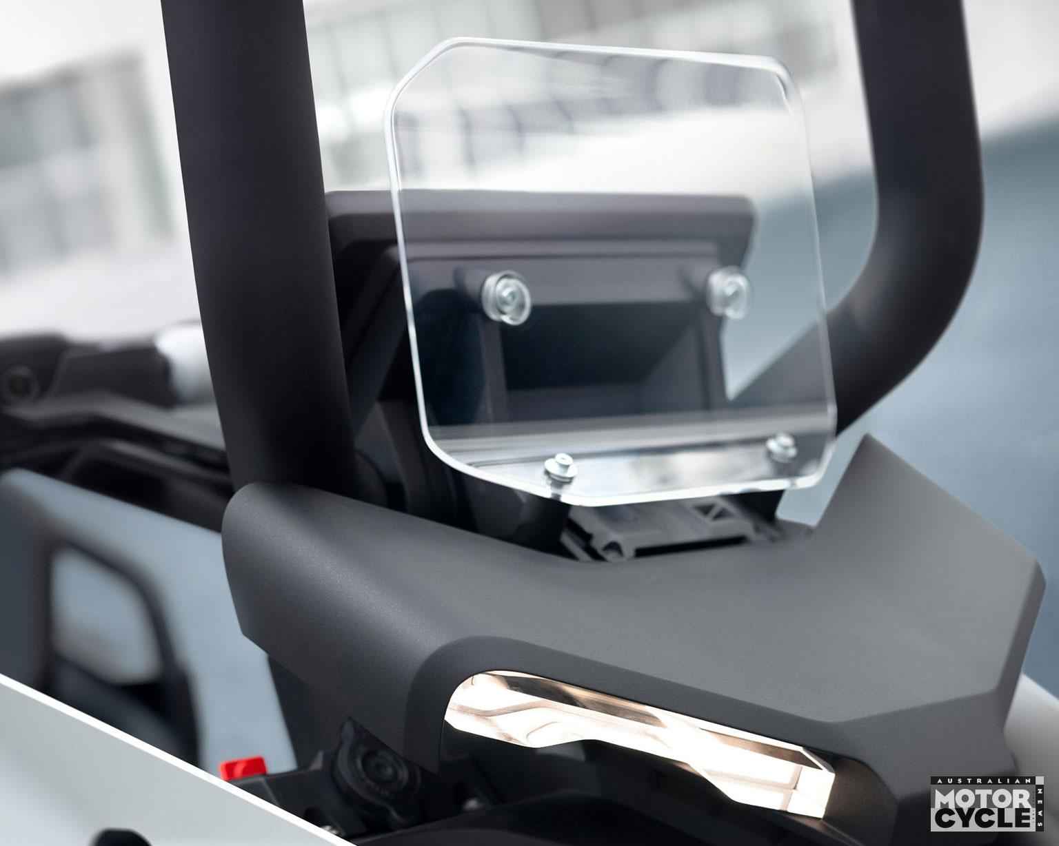 The publicity images might have the uncanny valley look of AI, but BMW has built a real mock-up of the Vision CE. There’s little explanation of its technical elements, but it’s clearly electric, probably with the CE-04’s powertrain, and claims to be able to self-balance, even when stationary. BMW has previously demonstrated an autonomous R1250GS, so the tech isn’t out of the company’s reach. A box behind the seat is labelled ‘Radar’ – so we know there’s a rear-facing sensor for blind spot monitoring at the very least.