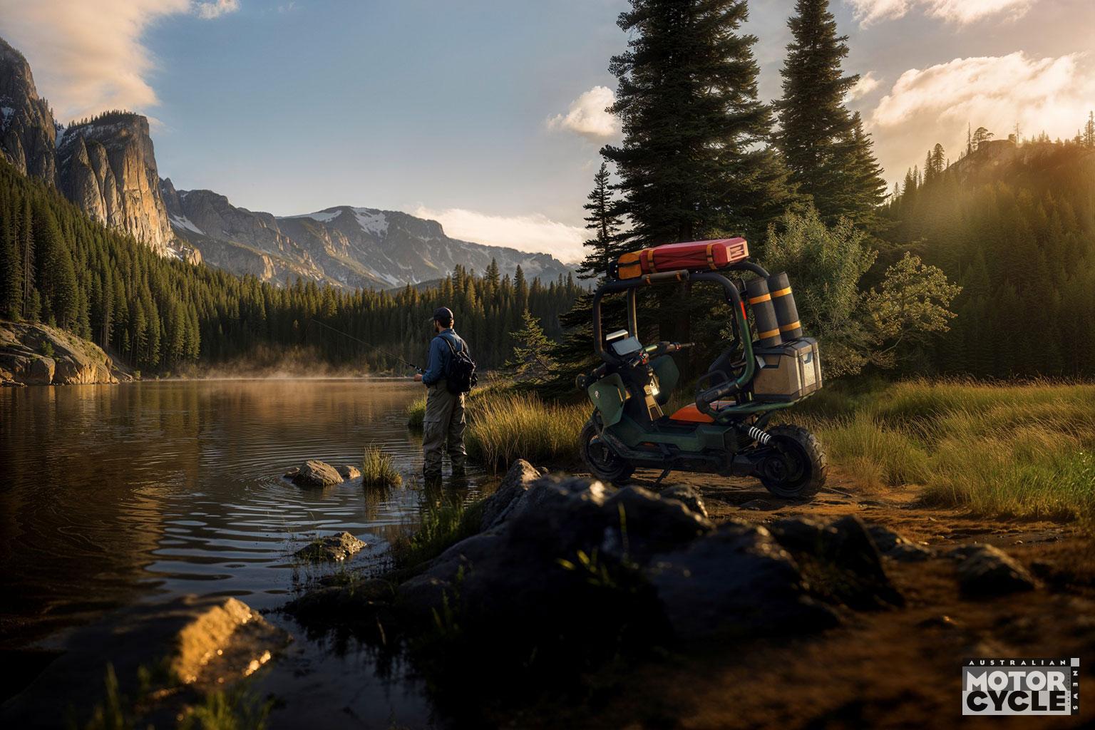 The cage also acts as a mounting bracket for accessories, and BMW’s illustrations show the Vision CE in multiple forms, from a mobile barista with a coffee machine lashed to the back to a plumber’s transport with pipes on the roof and toolboxes behind the seat. The glaringly AI-generated ‘photos’ of the concept are more leisure focused, including an adventure version with knobbly rubber and camping kit attached, and a variant that’s bizarrely kitted out as a mobile DJ.