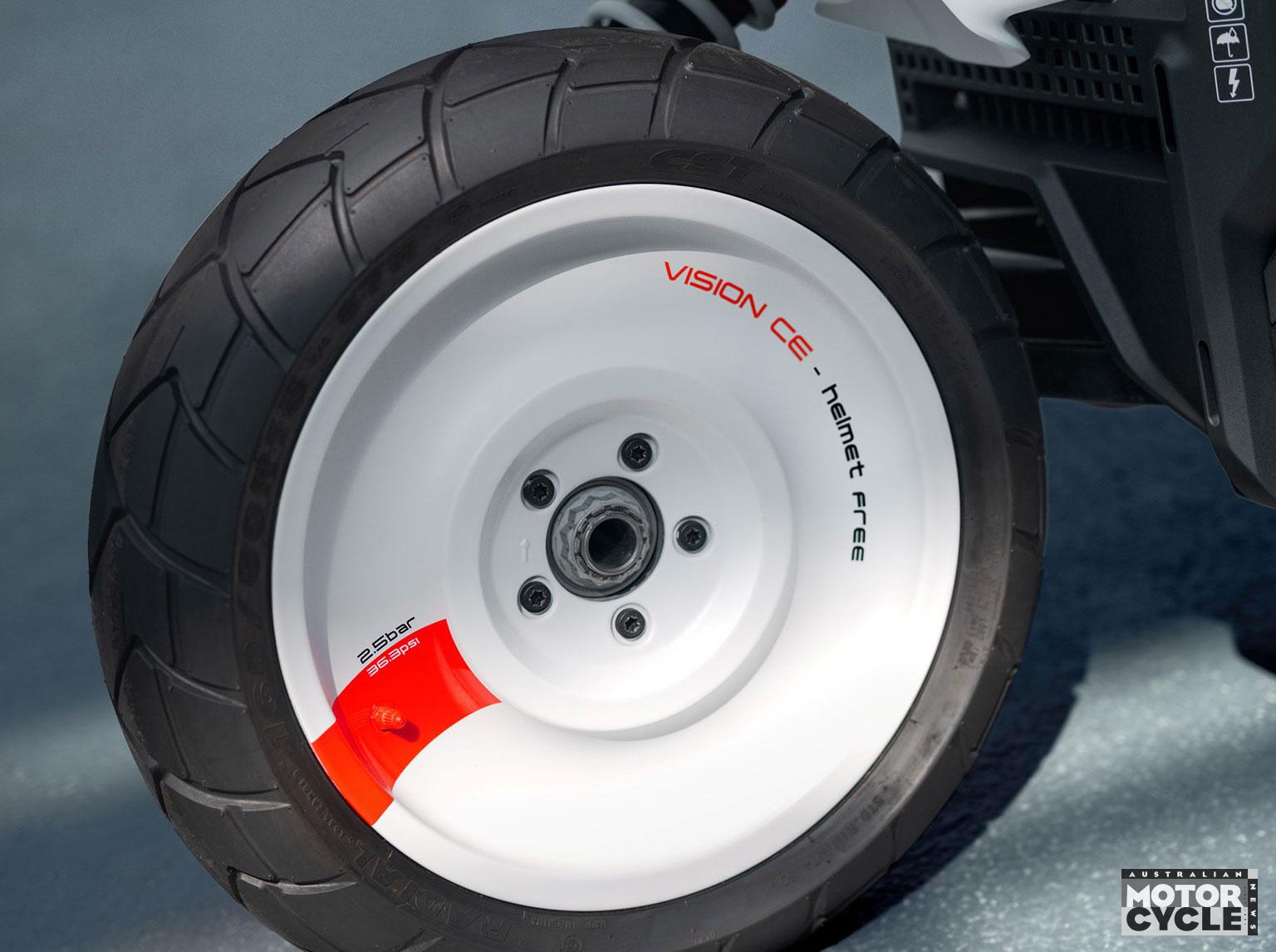 So, what is the Vision CE? Under the skin, it’s largely similar to the existing CE-04 electric scooter, with the same long, low chassis setup and similar styling cues with flat surfaces and crisp edges – a far cry from the egglike outline of the original C1. Its most distinctive feature is that box-like safety cage that surrounds the rider, along with a high-backed seat with four-point, harness-style seatbelts to keep them pinned in place. BMW says that, like the original C1, the Vision CE’s design means you don’t need riding kit or a helmet: if there’s a crash, you stay inside the safety cell and let it absorb the impacts.