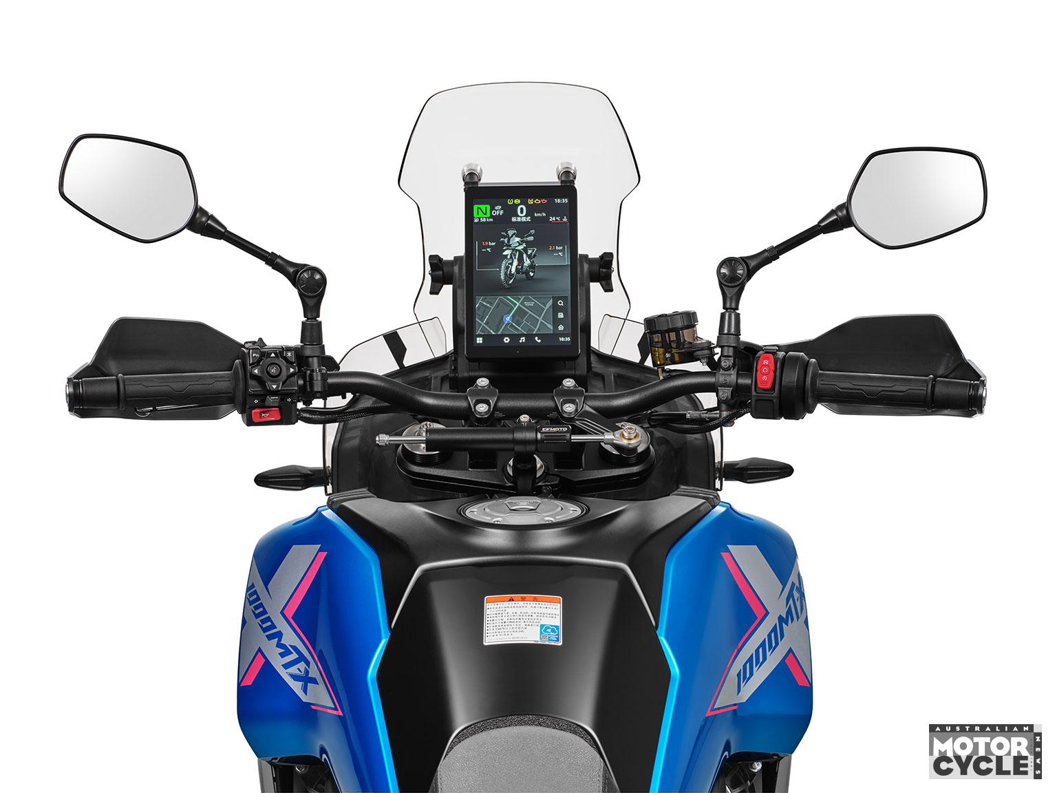 For touring and day-to-day use, the 1000MT‑X is listed with a 22.5-litre fuel tank and a claimed range of more than 500km under mixed riding. Equipment includes an 8-inch full-colour TFT touchscreen with Bluetooth connectivity, heated grips, a heated seat, cruise control and an adjustable windscreen. Standard protection items listed include a skid plate, handguards and a chain guard. The bike’s curb weight is stated as 222kg.