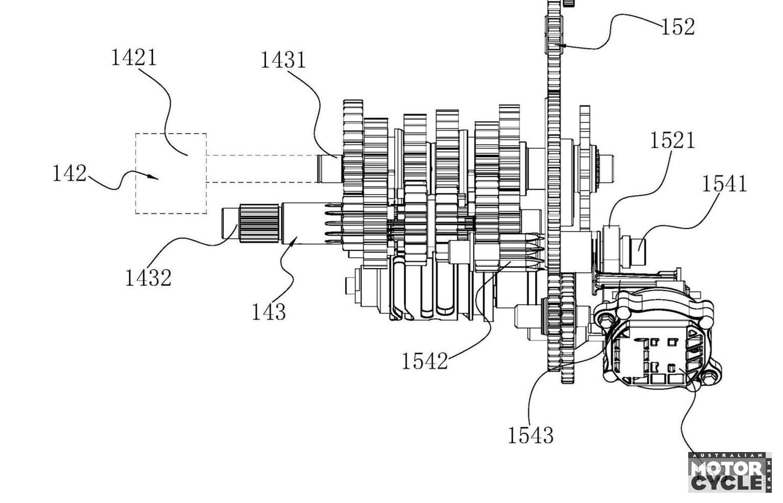 The proposed reverse gear system system uses an electric motor and a series of gears to connect it to the transmission, with its own gear fork – operated independently of the main gear drum via an electronic actuator – to engage or disengage the reverse. There’s a lockout that prevents it being selected when any of the forward ratios are also engaged, so you need to be in neutral before going into reverse and you won’t be able to put the bike into another gear until the reverse system has been disengaged.