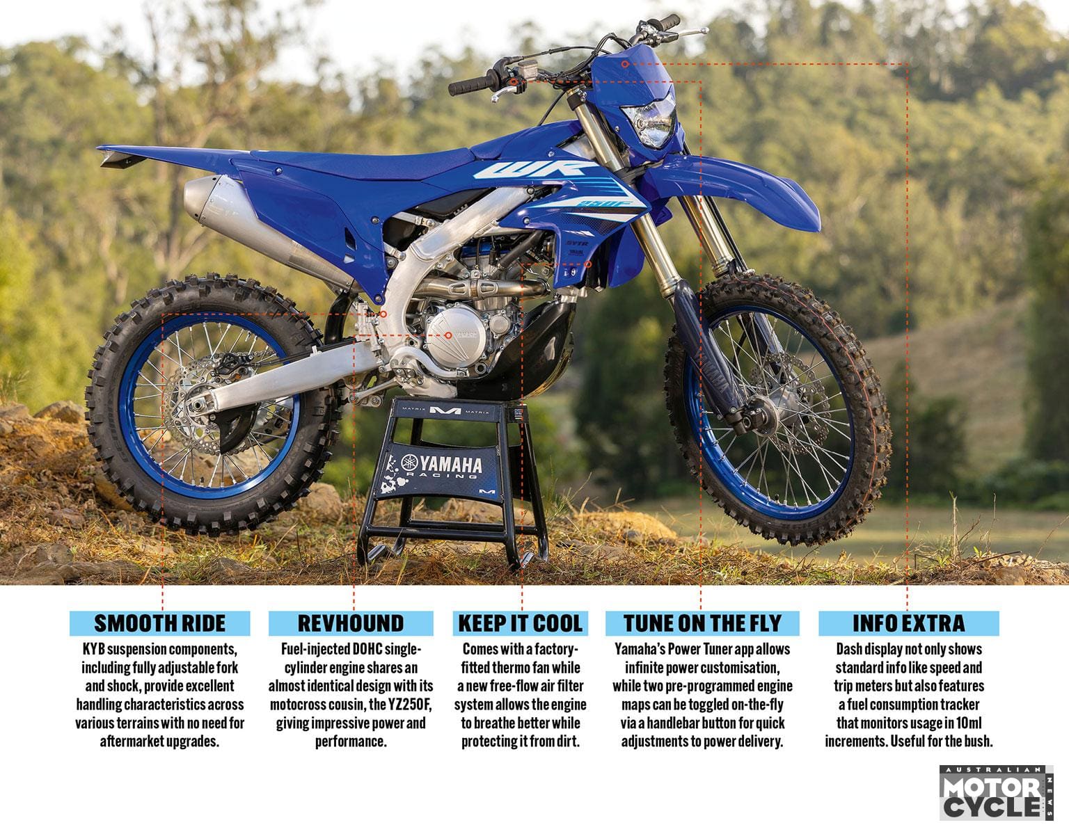 Yamaha notes that Australian WRF models are all supplied in full ADR spec to allow full road rego, including indicators, mirrors and horn. An off-road kit designed for closed-course competition comes free, including brushguards, front fender and lightweight rear light and tail section.