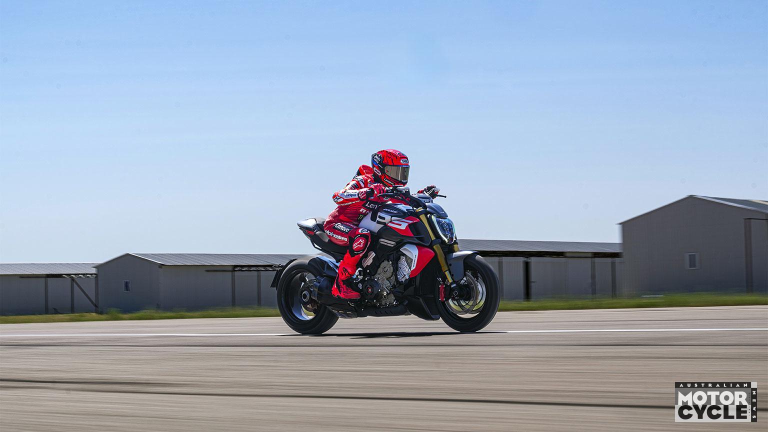 Once again, the normal Diavel V4’s 168h, 1158cc Granturismo V4 engine is ditched for the RS model, replaced with a 182hp version of the 1103cc Desmosedici Stradale V4. That peak needs you to rev it to 11,750rpm, and the redline doesn’t arrive until 13,500rpm and is stretched even further to 14,000rpm in first gear. That higher rev limit might well be a key to the Diavel V4 RS’s ability to out-accelerate any other production Ducati up to 100km/h, a target it hits in just 2.5 seconds (admittedly with Marc Marquez at the controls – your mileage may vary if you’re not a multiple world champion.) Ducati says the only machine it makes that can beat that mark is Marquez’s normal ride, the Desmosedici GP25 MotoGP bike.
