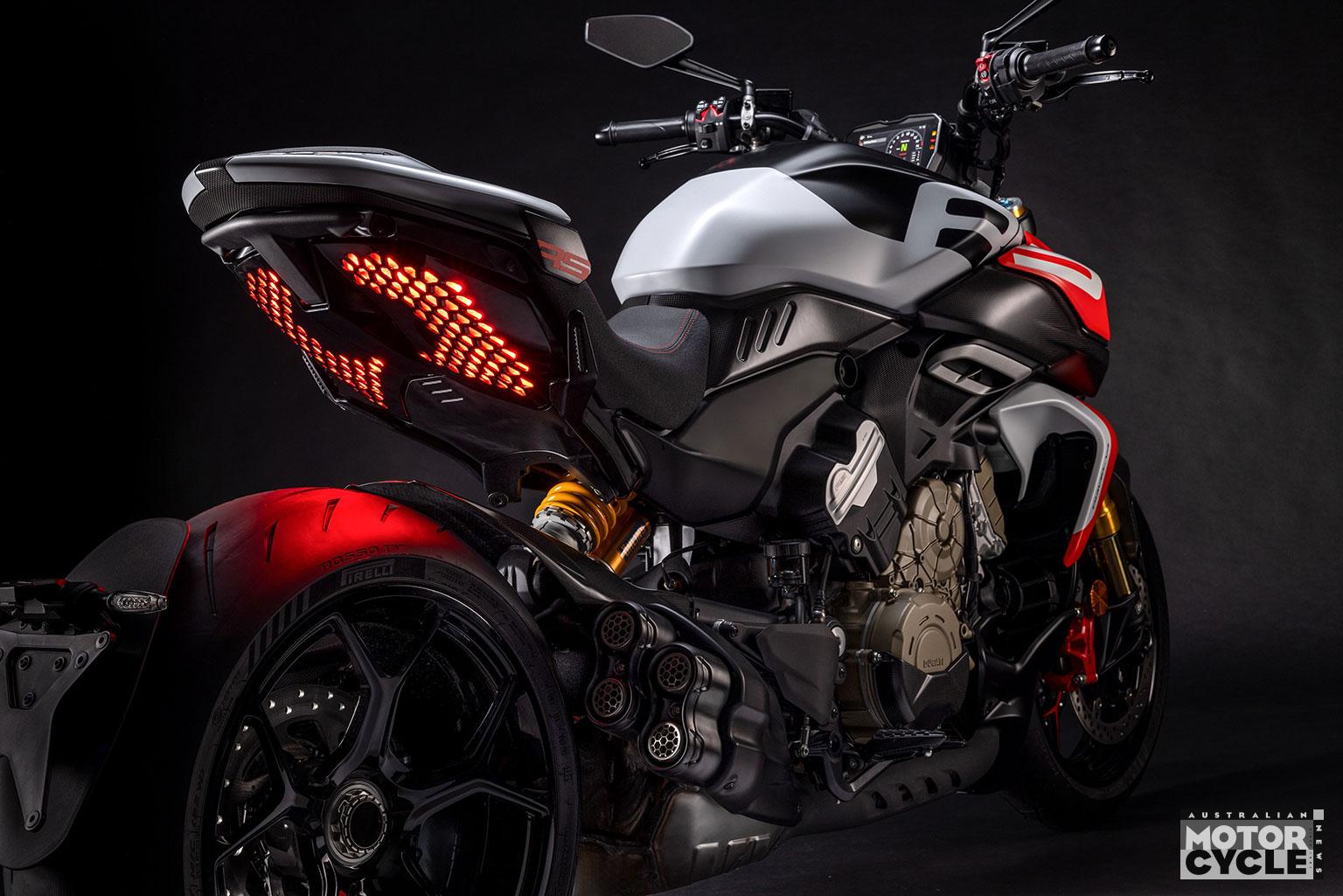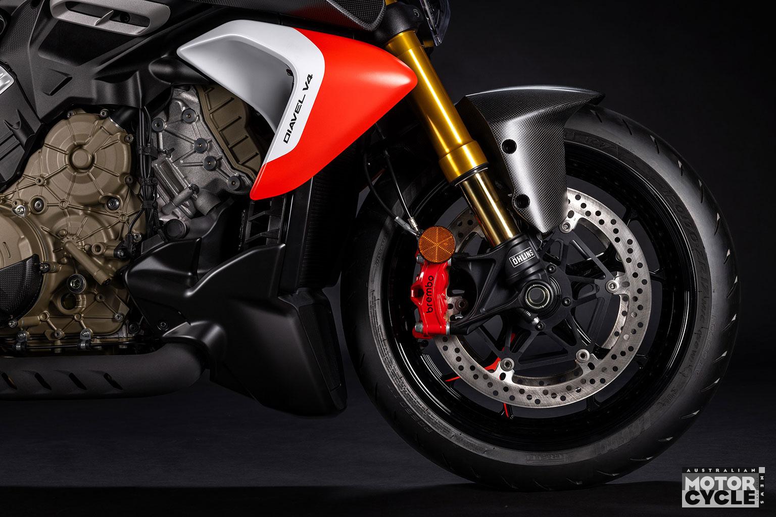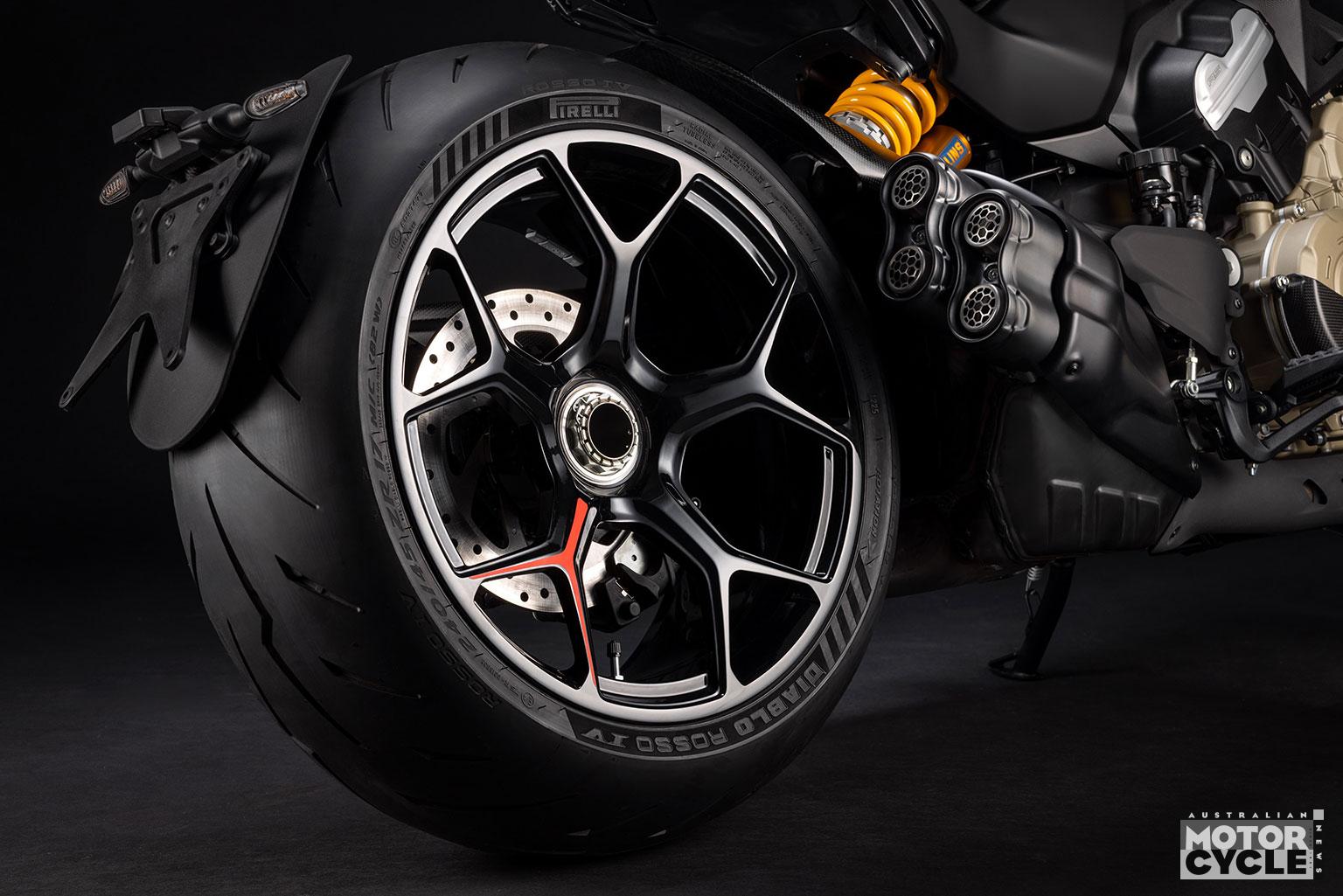 While the engine is the centrepiece of the changes, and includes a dry clutch and high-end electronics including launch control, wheelie mitigation, three power modes and four riding modes as well as cornering traction control, the chassis parts are also substantially upgraded. New, 48mm Ohlins NIX30 forks replace the normal, 50mm USDs, and there’s an Ohlins SRX46 rear shock to match. The updated wheels are shod in Pirelli Diablo Rosso IV tyres, which previously weren’t offered in the wide, 240/45-17 size that the Diavel uses at the rear.