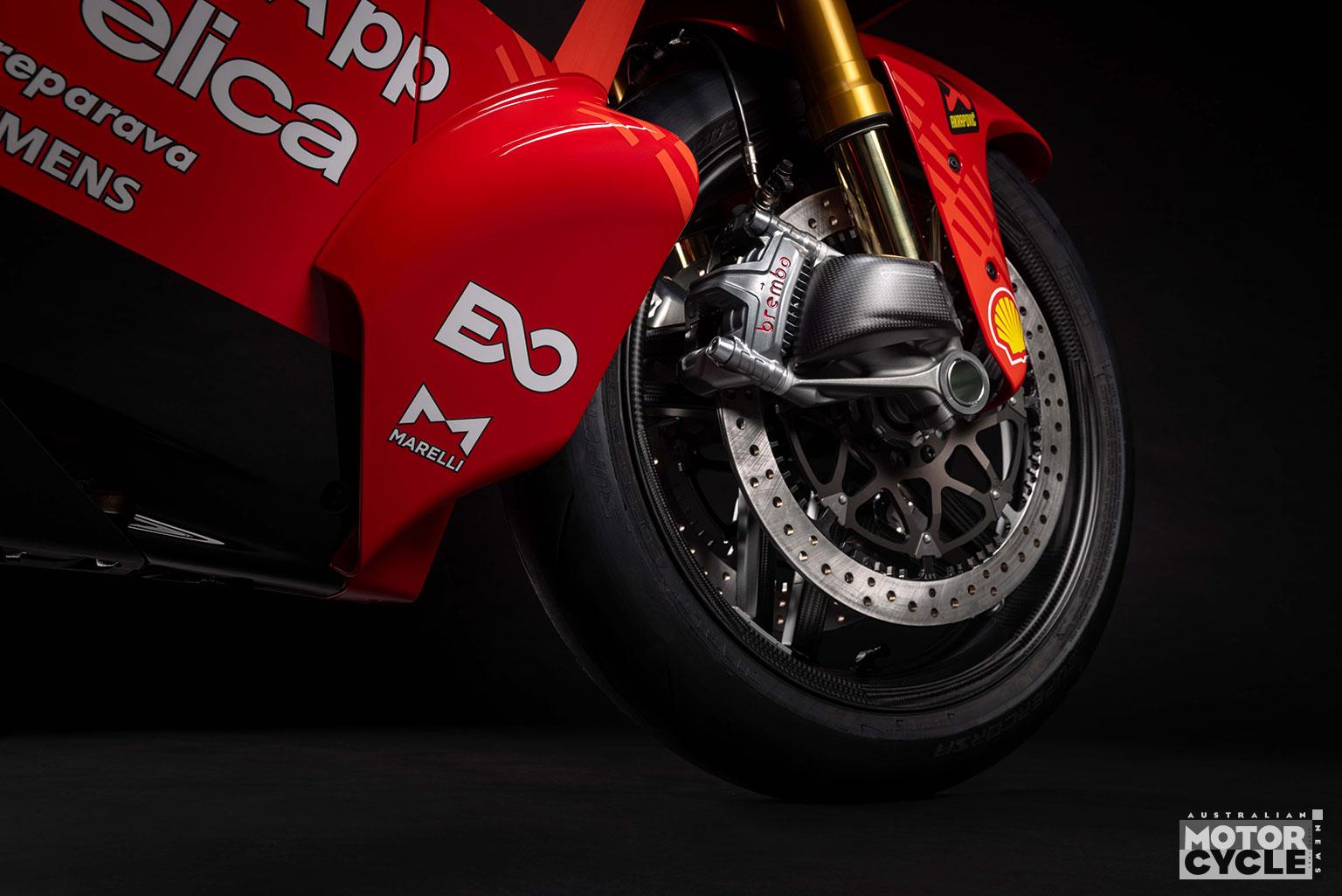 - Front Brake PRO+ braking system: double Brembo 338.5 x 6.2 mm T-drive ventilated front discs, Brembo GP4 Sport Production calipers, Brembo MCS 19.21 master cylinder with remote adjustment