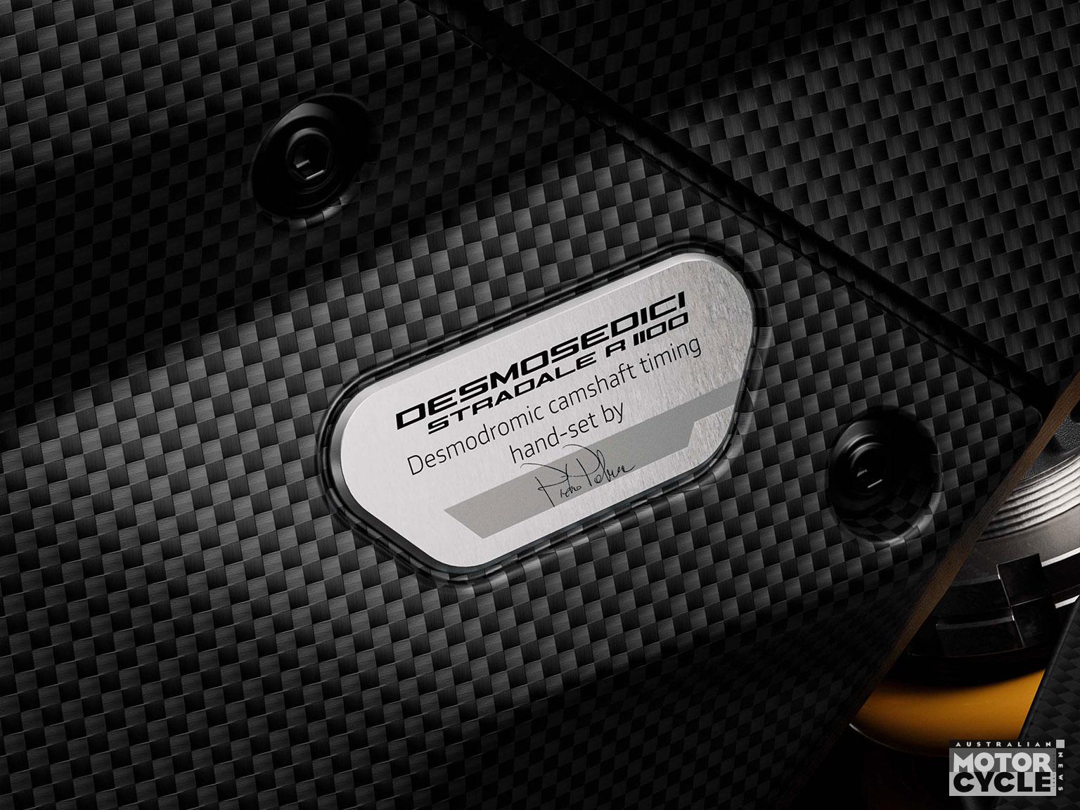 - Hand-adjusted desmodromic valve train with nameplate and fitter’s signature