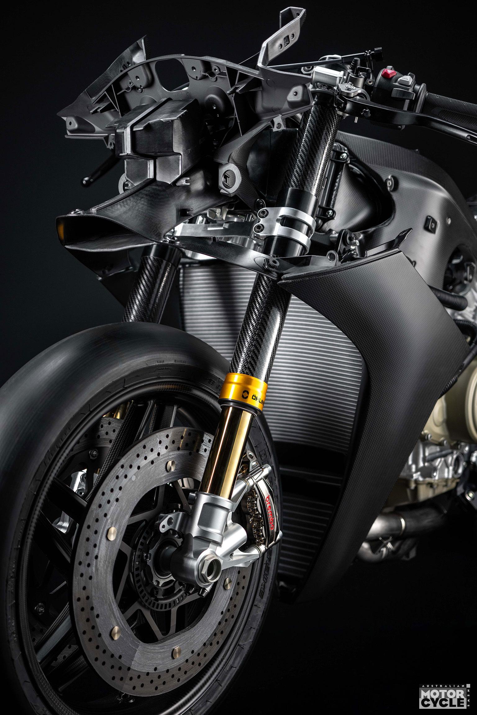 Up front is the pressurised, mechanical Öhlins NPX 25/30 Carbon fork, featuring carbon-fibre sleeves built from unidirectional layers to save weight. Ducati quotes an 8% weight saving vs. the Panigale V4 R, and 10% vs. the Panigale V4, with pressurisation used to reduce cavitation and maintain support during braking and corner entry.