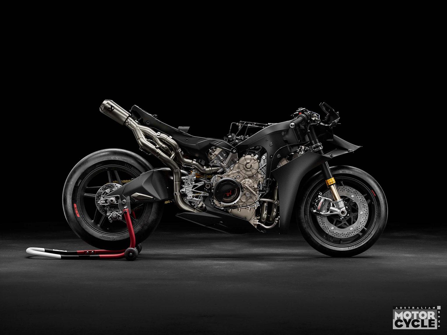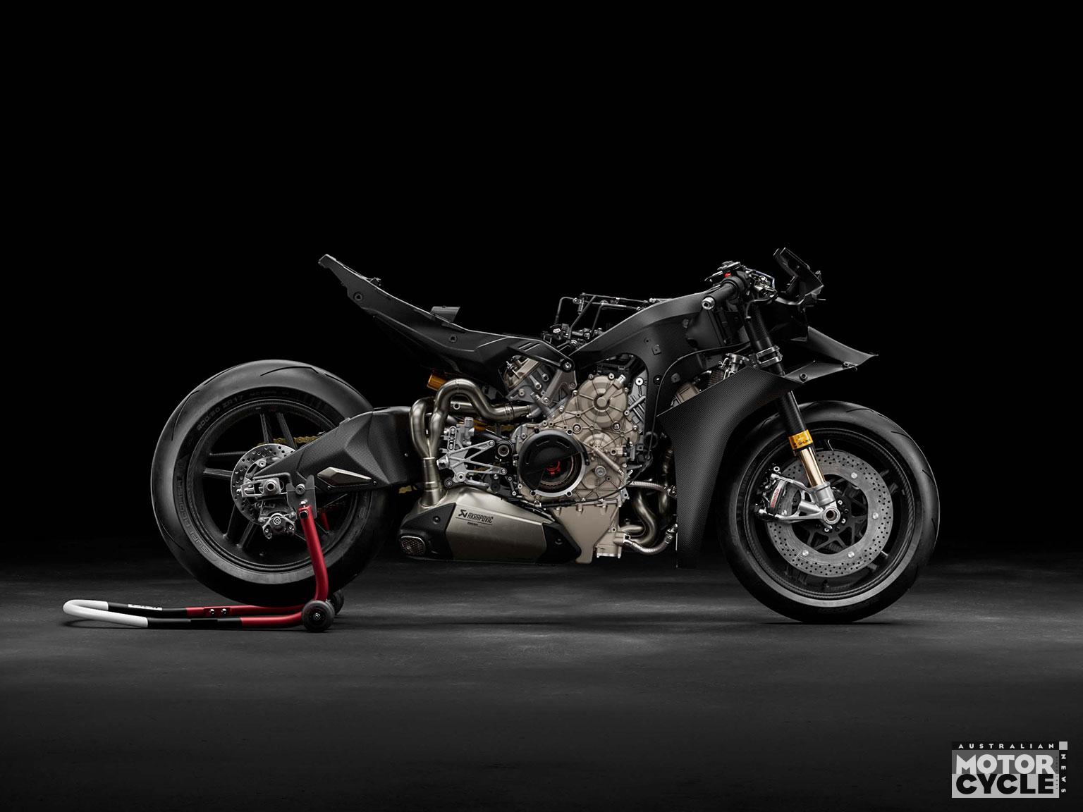 Ducati says the Superleggera V4 Centenario uses a fully carbon-fibre chassis—including frame, swingarm, subframes, and wheels—using processes derived from MotoGP and Formula 1. Ducati claims: