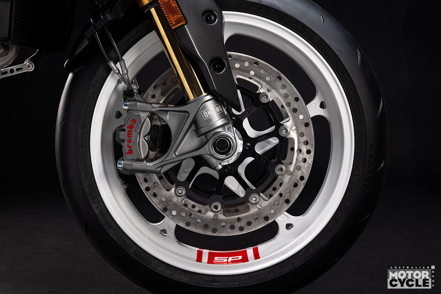Suspension is via fully-adjustable 46mm Kayaba forks and a preload-and-rebound adjustable monoshock on the base model, while the SP version switches those for Ohlins components, 48mm NIX30 forks and an STX46 shock. The SP also upgrades the brakes from Brembo M4.32 radial calipers to Brembo M50s, while switching the six-spoke cast alloy wheels for five-spoke forged alloys that slice even more weight from the bike.