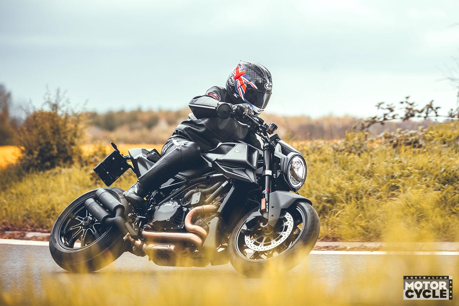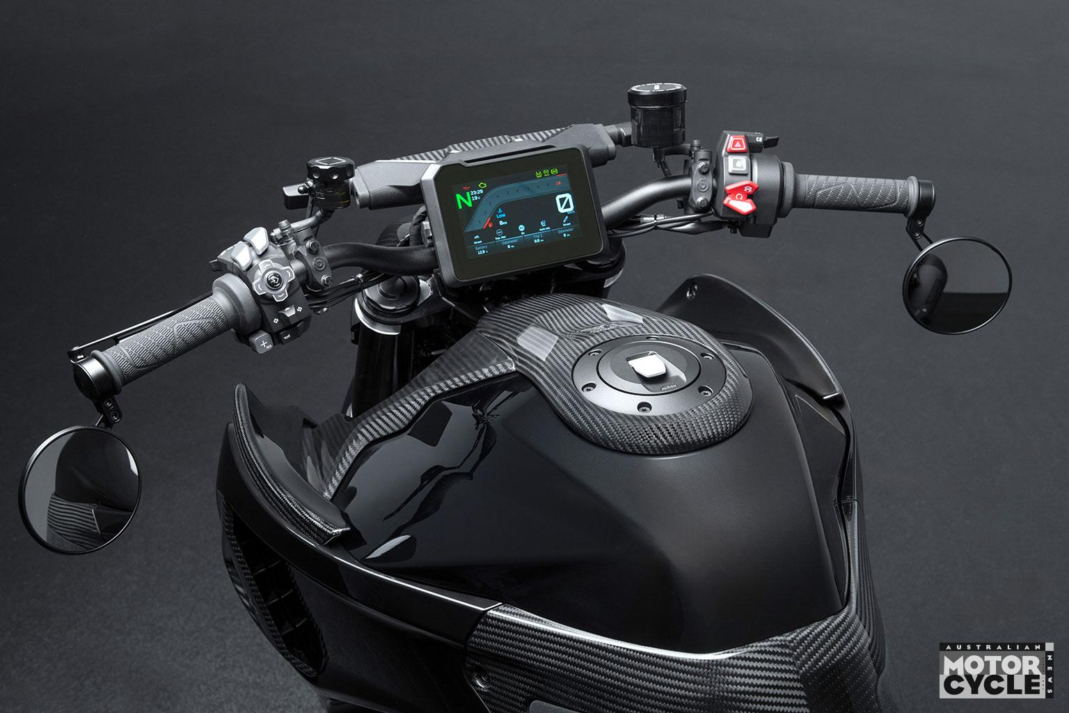 Those wheels carry Brembo’s latest high-end four-piston Hypure monoblock brake calipers – 10 per cent lighter than the Stylemas on the KTM donor bike – which grip twin 320mm Wave front brake discs, while the twin-piston floating rear caliper is paired with a 240mm Wave disc.