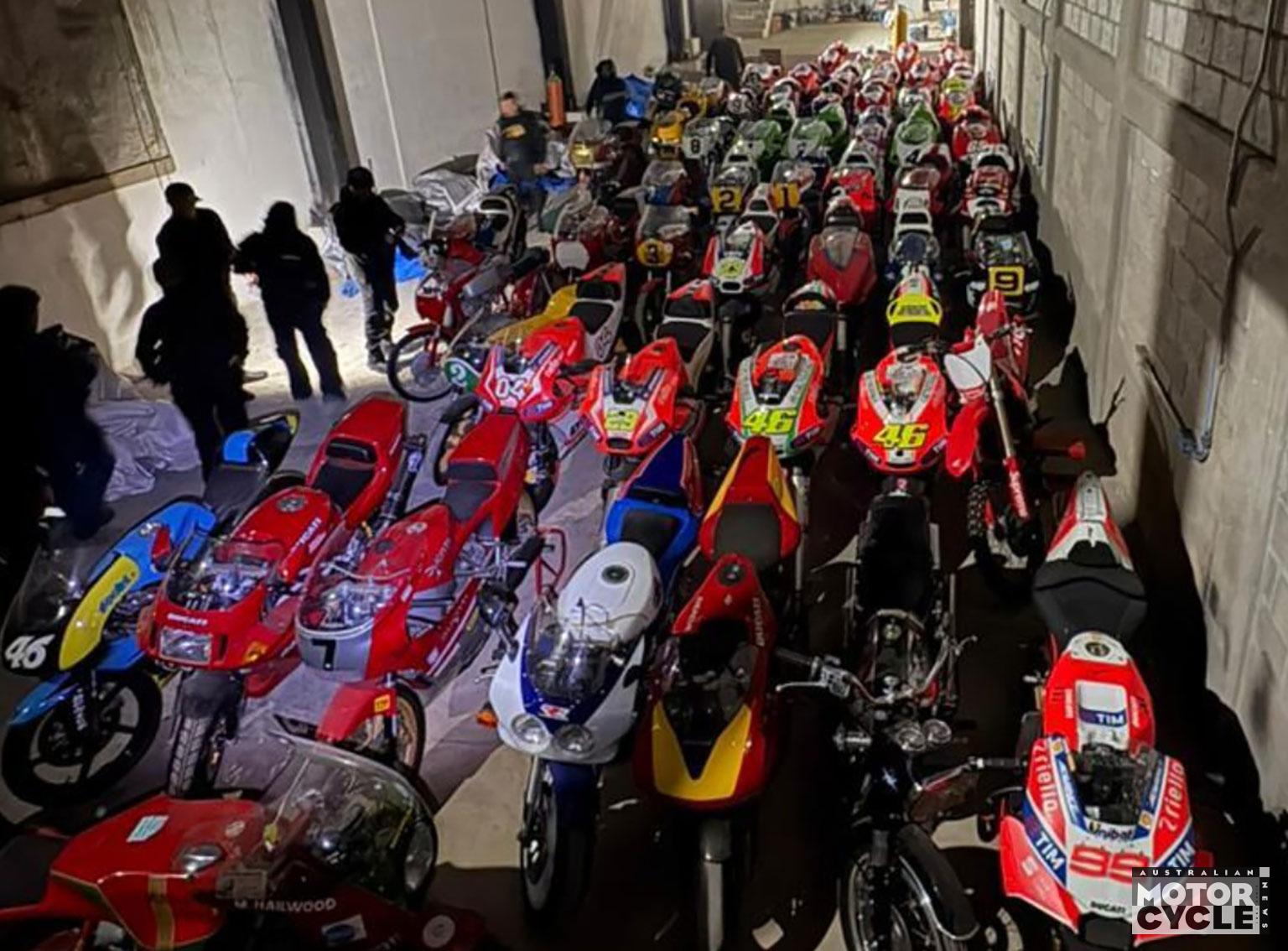 For motorcycle tragics, the collection is jaw-dropping. While it’s impossible to confirm which machines are authentic factory race bikes from the photos alone, the sky-high valuation suggests that many may be the real deal. The foreground of the warehouse shot shows Ducati GP liveries and numbers associated with racing legends including Valentino Rossi, Loris Capirossi, Andrea Iannone, Jorge Lorenzo and Andrea Dovizioso. Also visible are what looks to be a Marc Márquez Moto2 machine, a Rossi 125cc GP bike, and a mix of other highly collectible, exotic competition motorcycles including a Hailwood era Ducati 1980 NCR860.
