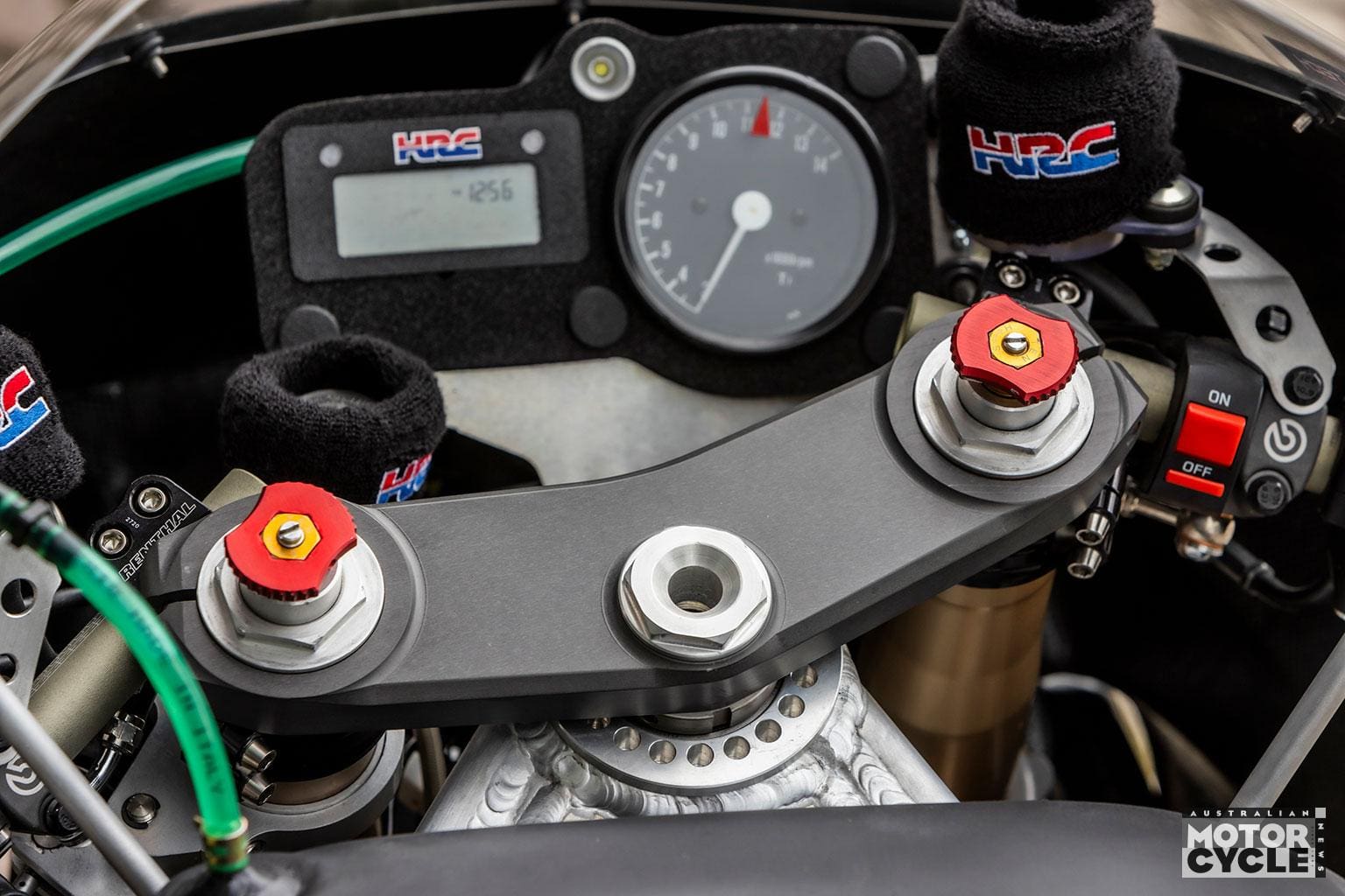 When Hirzel says ‘closest’ he’s not employing hyperbole. This bike’s carbon fibre fairing and self-supporting seat unit were created using genuine factory moulds – the ones that produced Doohan’s bodywork – by C-Tech Composites, the only firm outside Japan approved by HRC to make carbon fibre parts for BSB, WSB and GP Hondas.