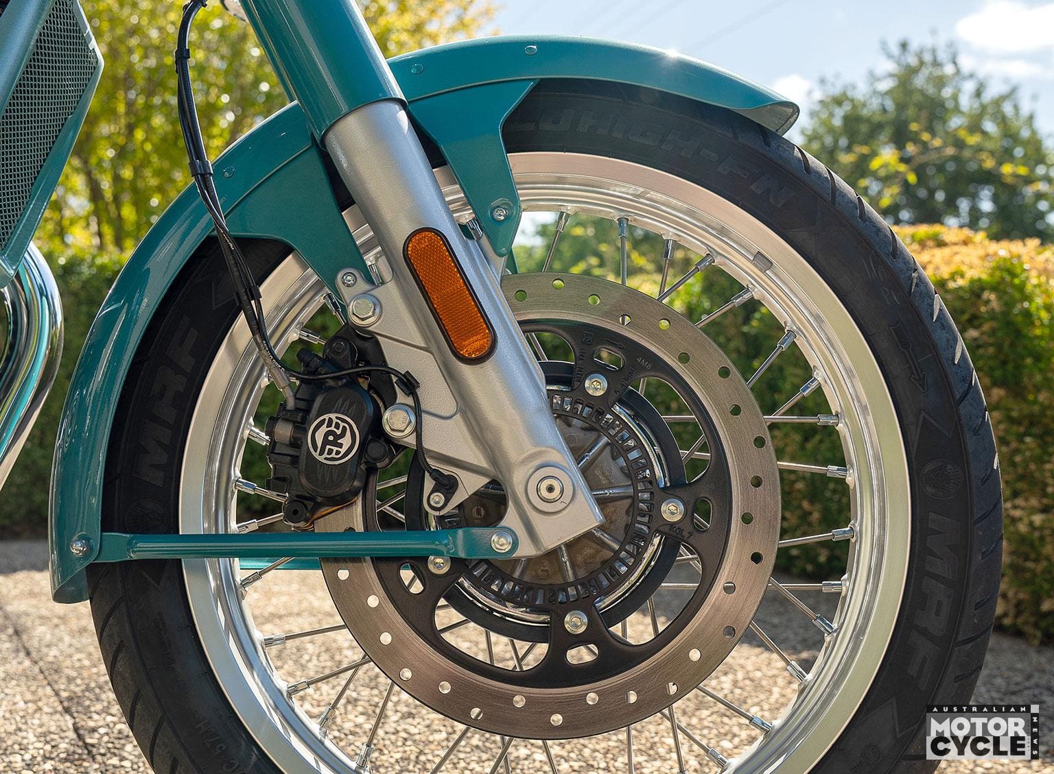 Suspension is a non-adjustable, conventional, separate-function Showa telescopic fork with 43mm diameter stanchions. Rear Showa twin shocks, with adjustable preload, have 90mm travel. Brakes are ventilated hydraulic single discs with Royal Enfield logos. The front 320mm disc has a twin-piston caliper and the 270mm rear a single caliper. Dual-channel ABS is the only rider aid.