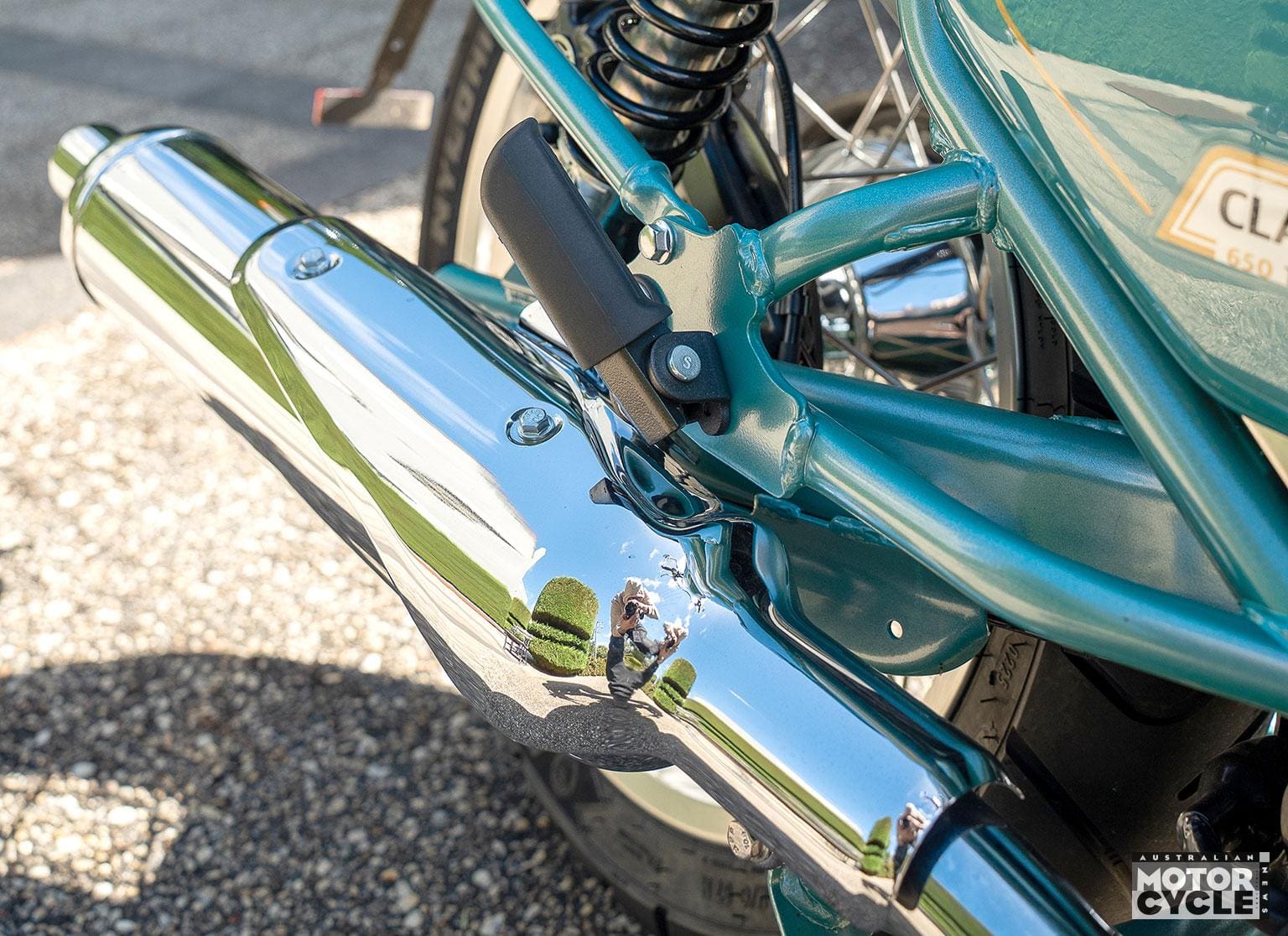 The solo seat is a nod to the period of saddle seats on early Brit parallel twins. While it looks very 1940s set up like this, the Classic 650 comes with a pillion seat and associated subframe that is easily attached or removed.