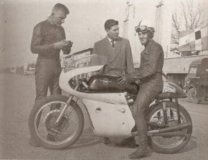 Geoff Duke with Derek Minter (seated) and John Hartle at Monza test March 1963