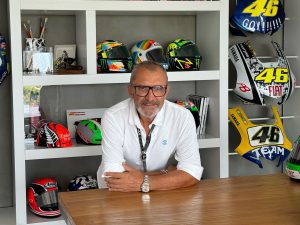 Aldo-Drudi-with-some-of-his-helmet,-leather-and-bike-designs-OXLEY-PHOTO