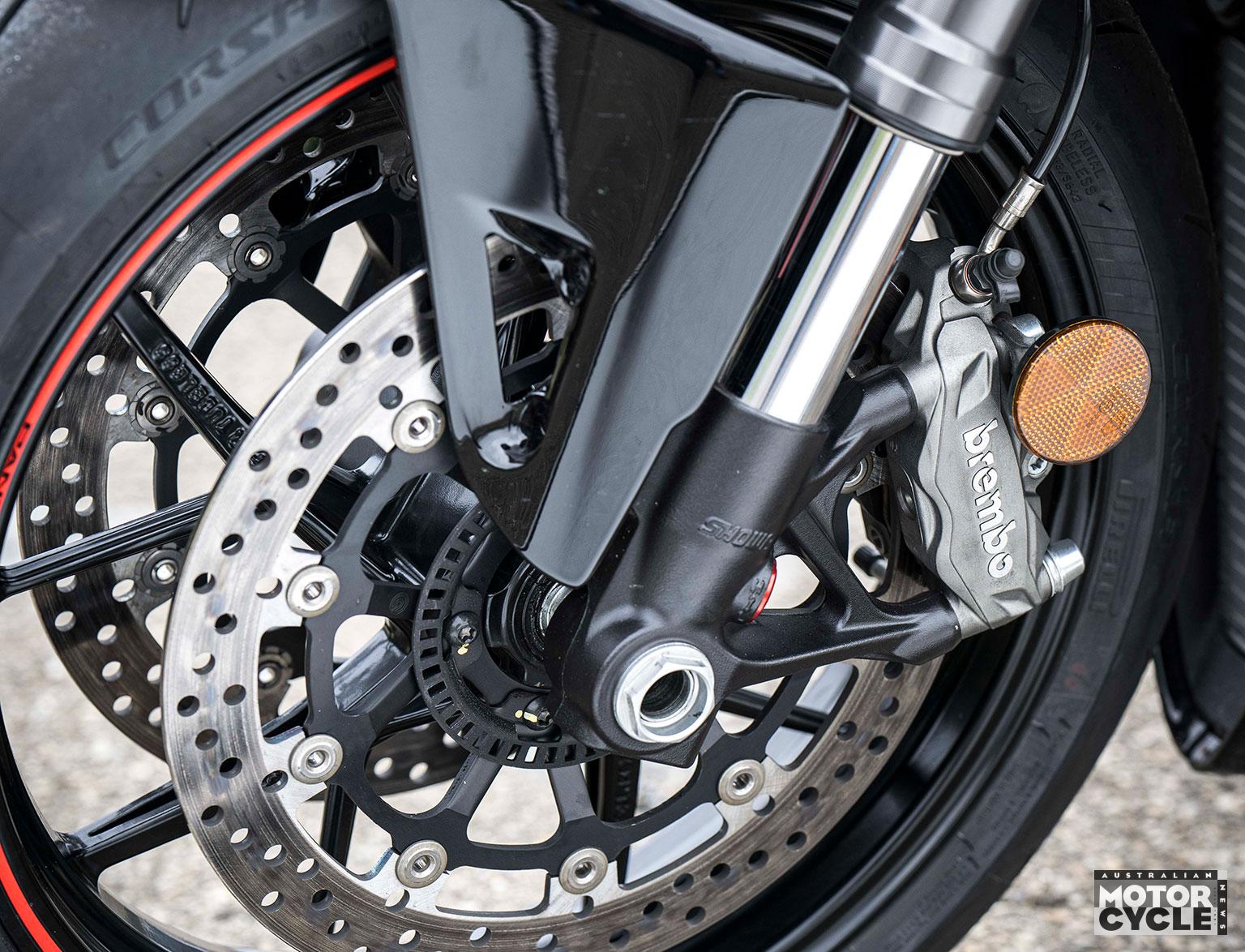 Front Twin 320mm discs, radially mounted Brembo M50 calipers