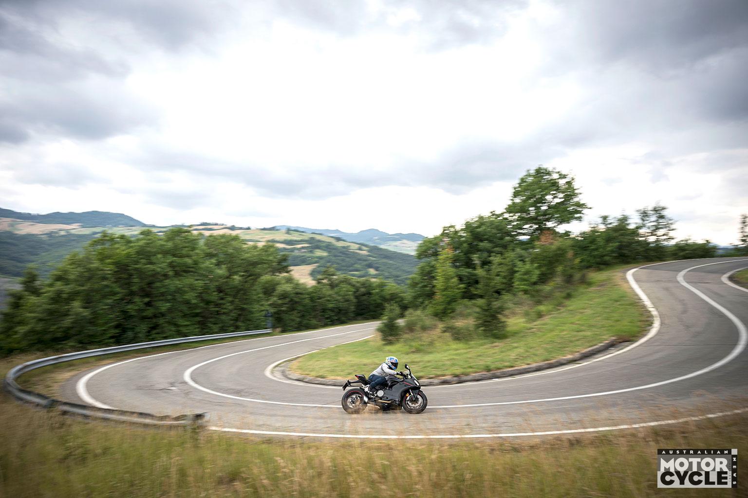 I wanted to love the old Panigale, and I still think it looks good today. And every time I rode it hard, it rewarded my efforts. But for 90 per cent of the time, I always wanted to be on the more sophisticated V2. So as soon as we started the ride back to Bologna, I opted for the new bike. I felt guilty as we commuted back through the busy Bologna traffic, watching my good friend Ed try his utmost to get comfortable on the older Panigale while trying to prevent his testicles from cooking.