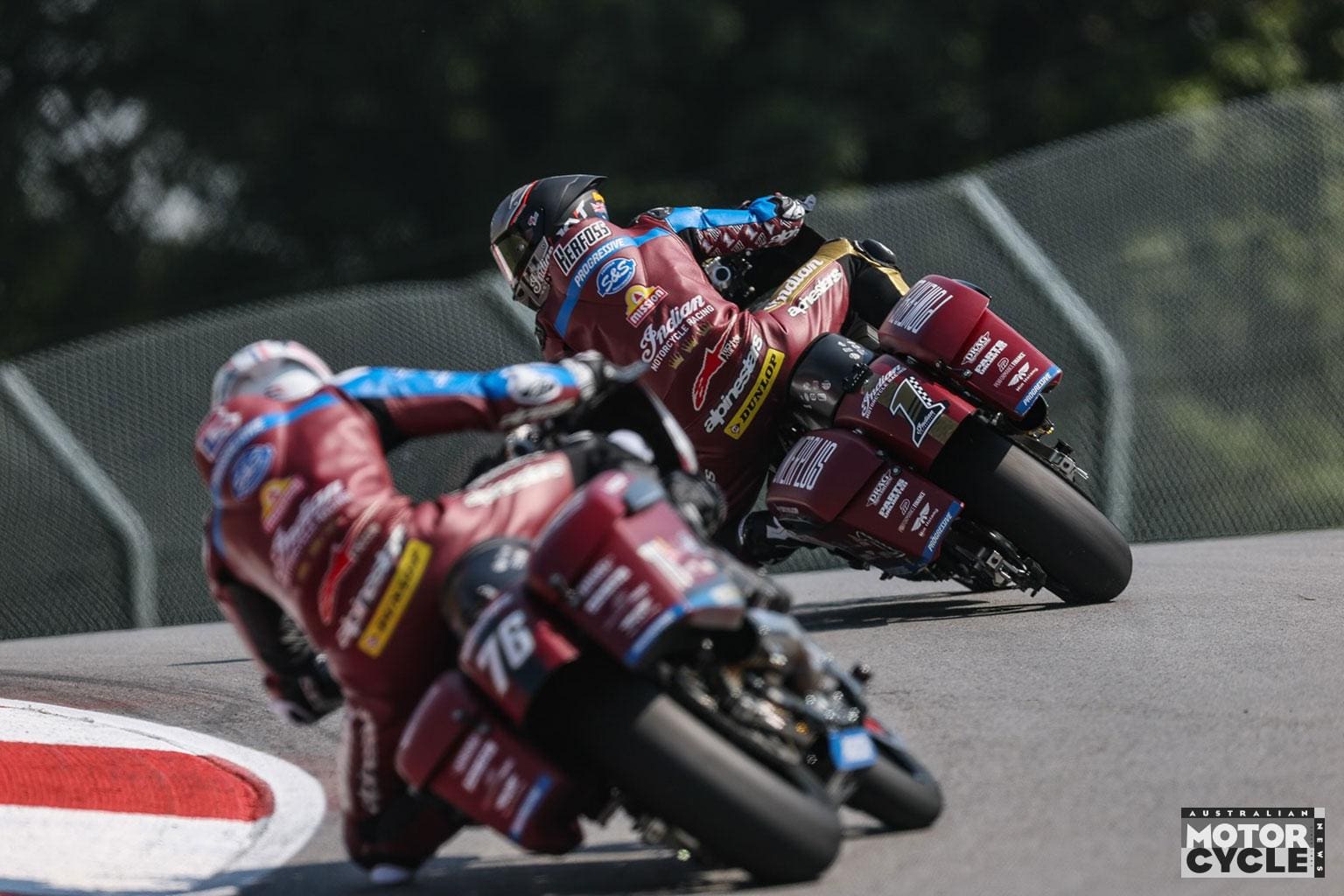 “After Laguna, I didn’t talk to anybody at Vance & Hines,” Gillim said. “I didn’t talk to anybody on the team. I didn’t talk to anybody for two and a half weeks. It was a long, long weekend. The Vance & Hines guys put in a ton of work, and we actually went testing last Saturday. It was supposed to be a two-day test, to kind of do some durability testing on the transmission, because that’s what our problem was at Laguna. And we found a whole other problem. We blew up both bikes in the span of an hour. So, they had to go back to the shop. They were there Sunday, Monday, Tuesday, Wednesday. I think they loaded up the last load on Thursday morning to drive up here. They had to go back and refigure every motor that we had in the shop and the bikes. So, it’s been a long year. This is my first podium of the season. After last year, being pretty competitive at times, we just have struggled and we’re finally finding our footing again. This one I wasn’t going to give in very easy. I tried swapping up some lines on the back straight. I could hear him kind of gassing it a little bit sooner than I was coming out into the next left. So, I was thinking maybe he was rolling around on the outside a little bit better. It’s hard. Luckily, I had the Superbike race to feel all that out. So, I kind of knew what the lines were like. I was getting tired there at the end. He started closing up on me. I started getting tighter and tighter and tighter. My left arm was cramping going through the Keyhole and everything. I was gripping it so tight. ‘Don’t give this up, man.’ It was just a good day, good weekend. Keep this going tomorrow.”
