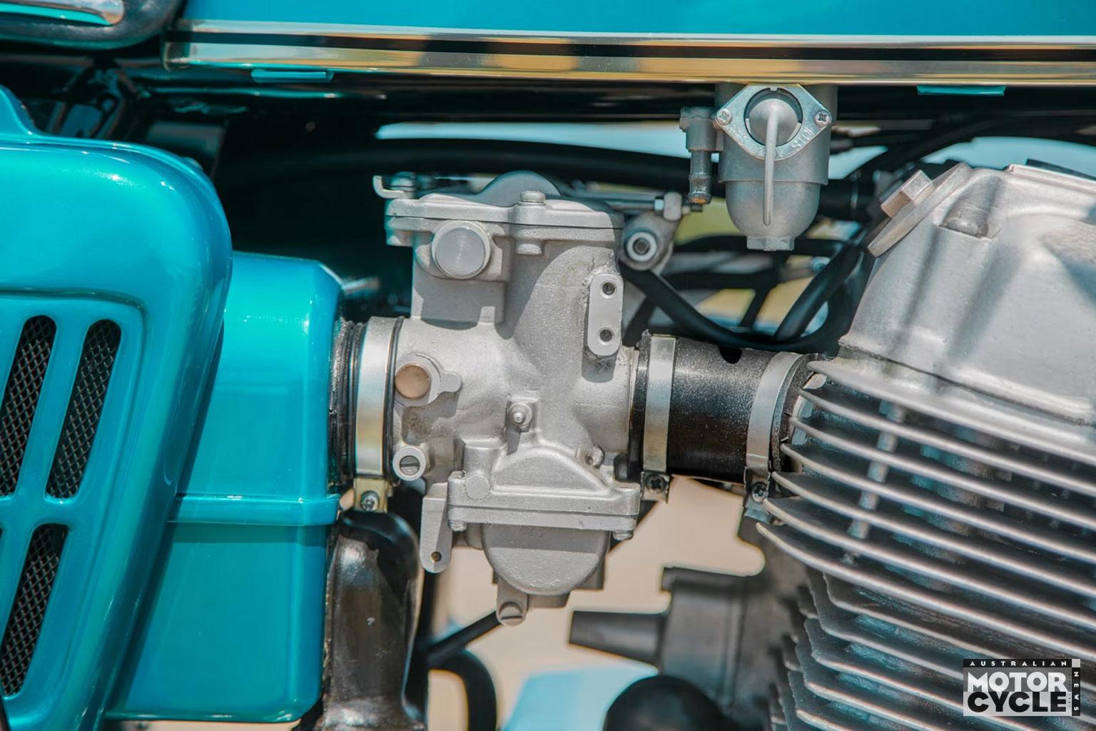 It has unique features, including badging, starter motor cover, one-off sandcast carburettors with shared floatbowls and an accelerator pump, an early version of Honda’s disc brake and a seat that flips up to the rear not sideways. The speedo reads 446 miles.