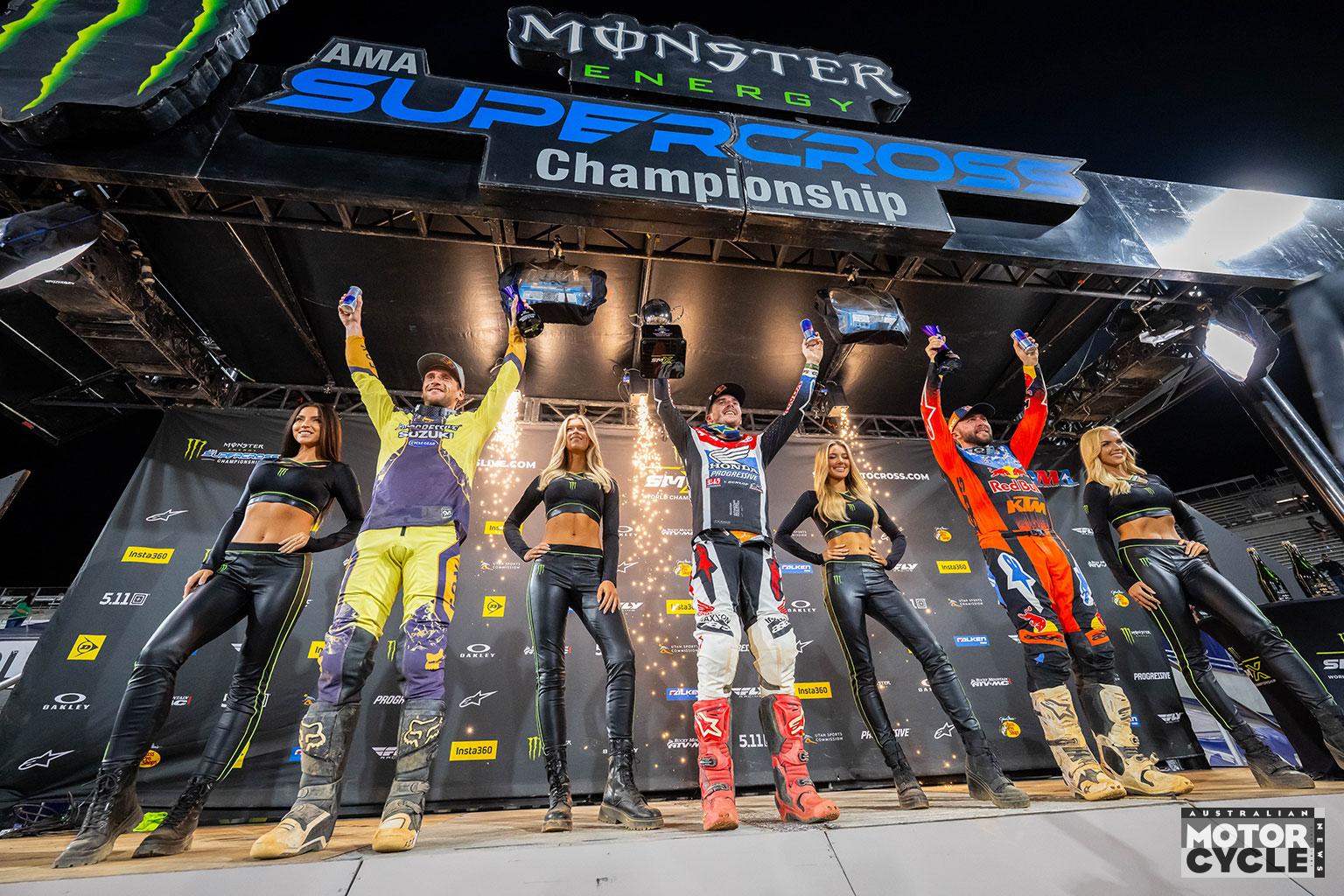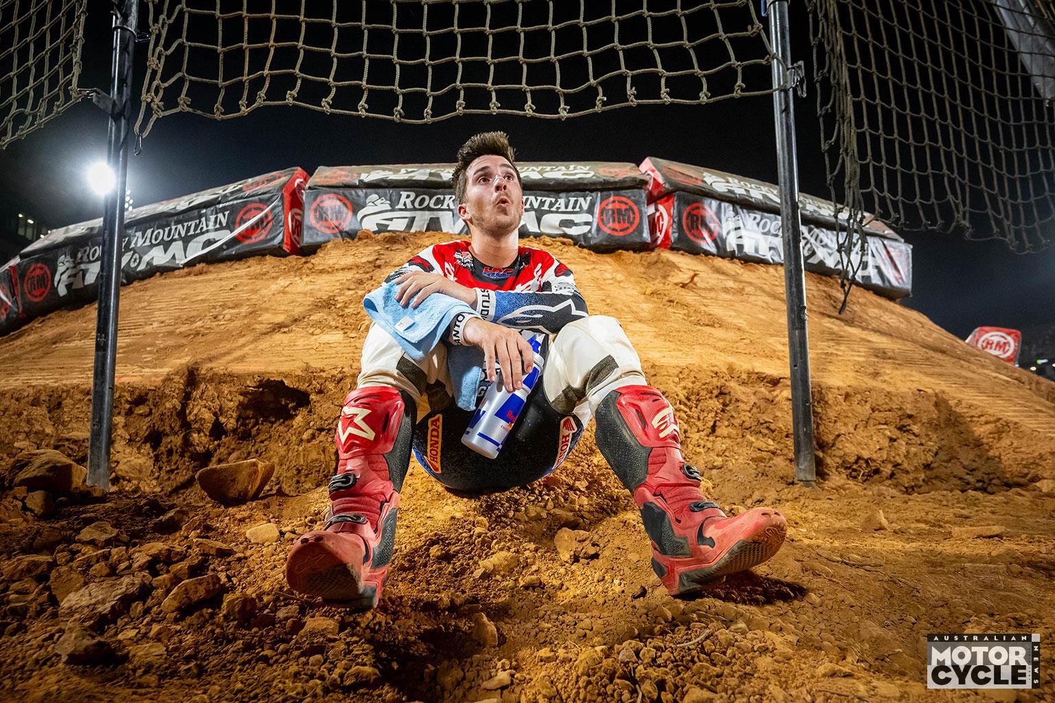 “The track layout was rather simple, but the conditions made it tricky, and we did a lot of laps. Kenny [Roczen] had a really good pace; when he got around Eli [Tomac], he put in some good laps, and I’mlike, ‘Alright, this is his really good sprint speed, so I need to kind of push at the beginning.’ I was trying to push as much as I could. That’s one of the things I find the coolest: a high-pressure moment or high-stakes scenario, and you’re able to deliver. You’ve got to be consistent, precise and just push the whole main. I don’t really want to think about the title, because it’s still seven races away and so much racing left to be had. I’m just trying not to be an idiot, and focusing on the week-in and week-out.”