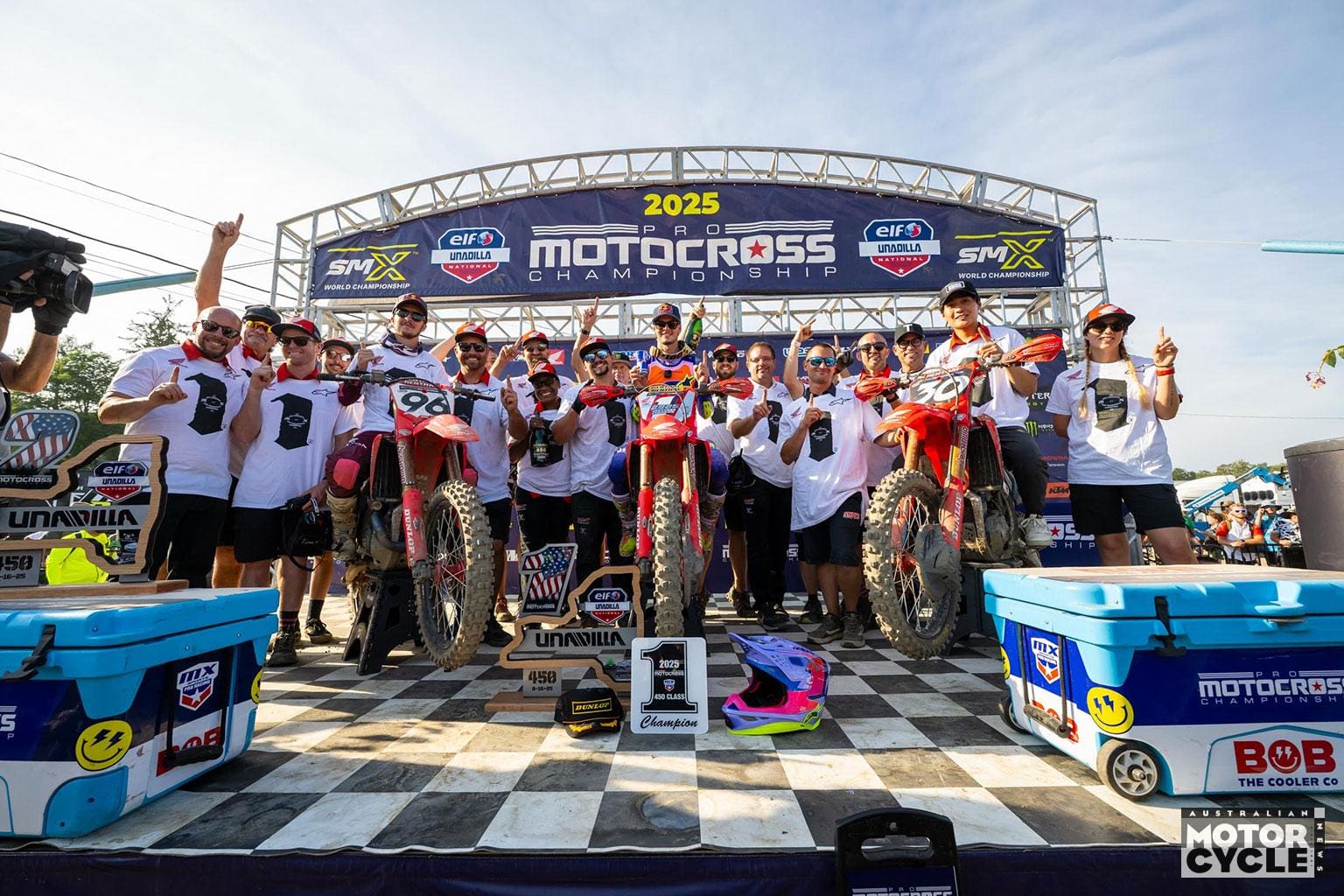 NEW BERLIN, New York (August 16, 2025) – Jett Lawrence reclaimed the 450 AMA Pro Motocross National Championship with a crushing 1-1 performance at Unadilla MX, sealing the 2025 title one round early aboard his factory Honda HRC Progressive CRF450RWE. The Australian star has now won nine of 10 overalls this season, with only next weekend’s Budds Creek finale in Maryland remaining.