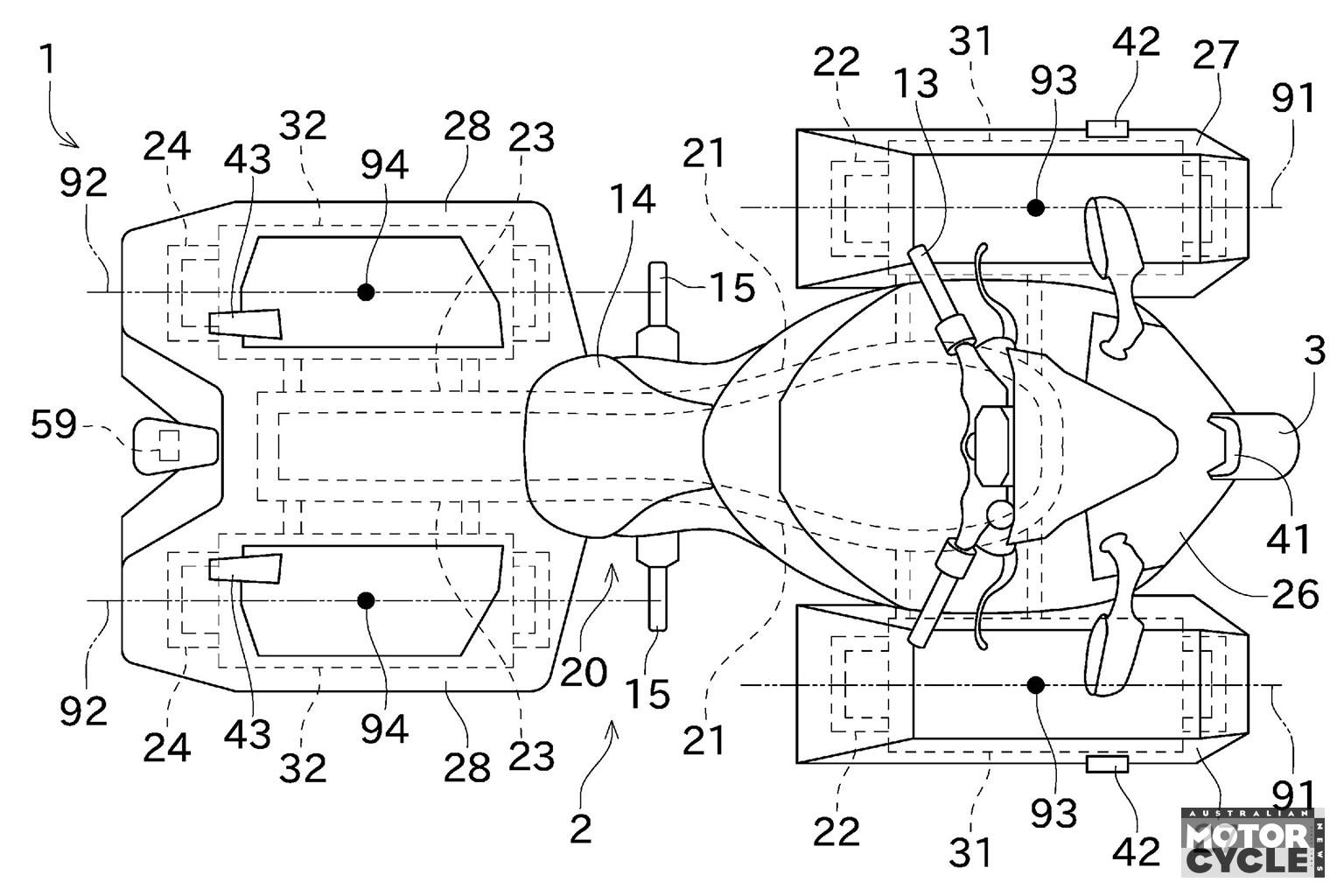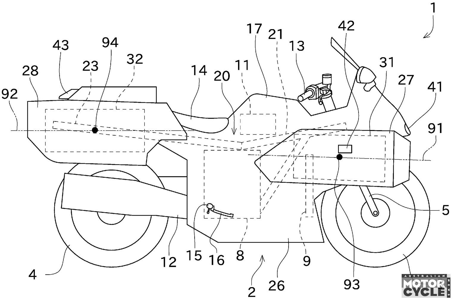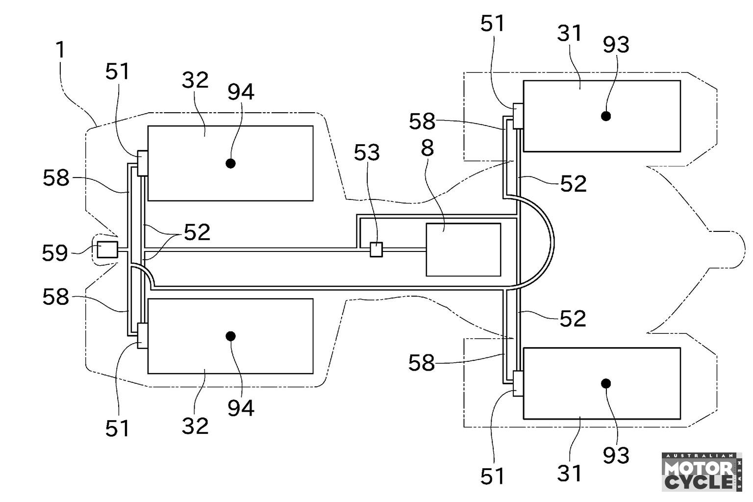 KAWASAKI’S PROTOTYPE for a supercharged, hydrogen-fuelled motorcycle based around the engine from the H2 has already been publicly demonstrated more than once and grabs attention with the vast, rear-mounted tanks needed to store its fuel. But with range remaining a stumbling block for hydrogen combustion engines Kawasaki has filed a patent that aims to solve the problem by adding two more enormous tanks on the front of the prototype.