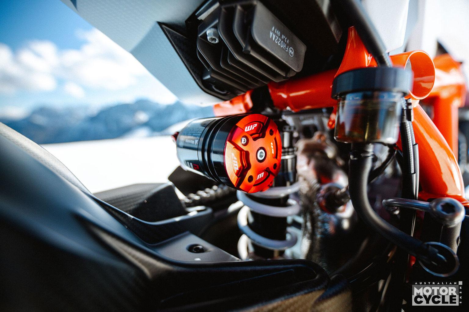 The chassis might be the same steel trellis as the rest of the range, but it’s equipped with race-oriented WP Pro Components 8458 closed cartridge forks, fully adjustable for compression and rebound damping of course, and a WP Pro Components 8750 rear shock that’s similarly adjustable. The bike will come with a set of KTM recommended suspension settings to get owners on the right track.