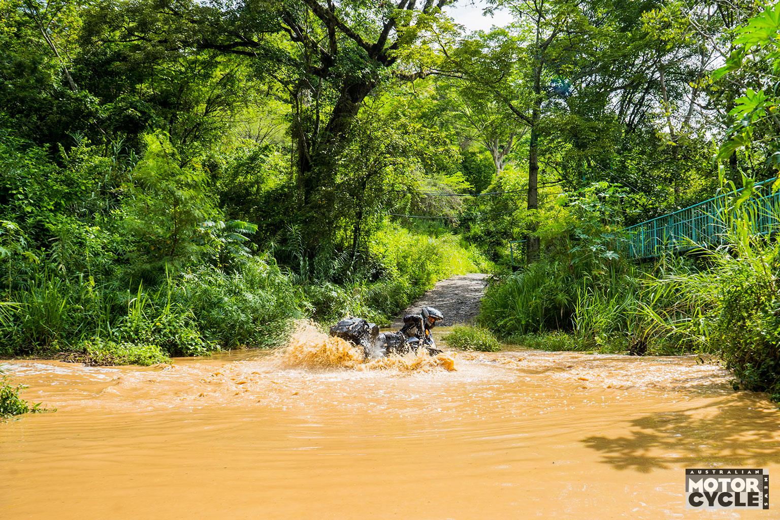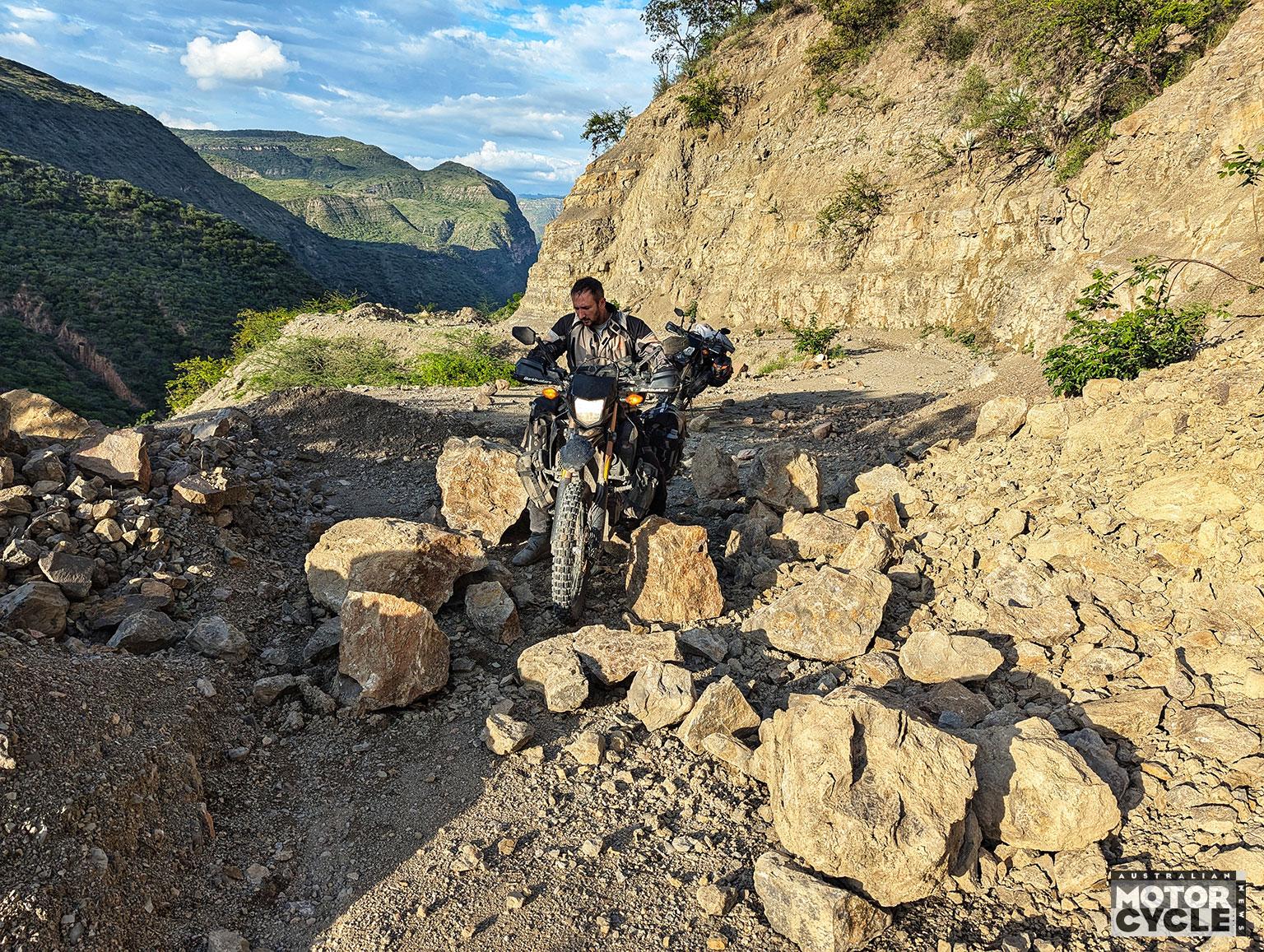 It’s not going well… “This can’t be right,” says Alissa, exhausted as she unclips the panniers again so we can squeeze our motorcycles around boulders in the road. Huge landslides from the recent storms have destroyed the trail, leaving it covered in rocks, with chunks of mountain blocking our path and sections missing. Nobody has been up this way in a long time. Our gear is soaked in sweat, the going is painfully slow, we’re alone, running out of water and losing light. But it’s the only way out – and we have hours ahead of us.