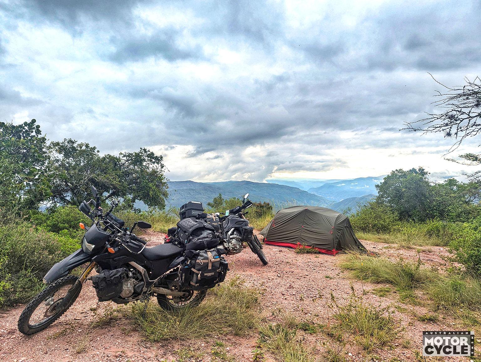 We turn a corner to find our track washed away with a thin slice of mud on the edge of a cliff to ride over. I just about make it and then hear Alissa scream behind me. Her back tyre slips and the bike starts to fall. Somehow, she manages to hang on and save it before they both go. We take our helmets off, our faces caked in a paste of dirt and sweat and look at each other. We haven’t been this tired since Siberia six years ago. But it’s funny how you keep going in these situations – until one of you nearly falls off a cliff, and only then it’s “maybe we should stop now?” We’re not going to make it out before dark and make the call to camp…
