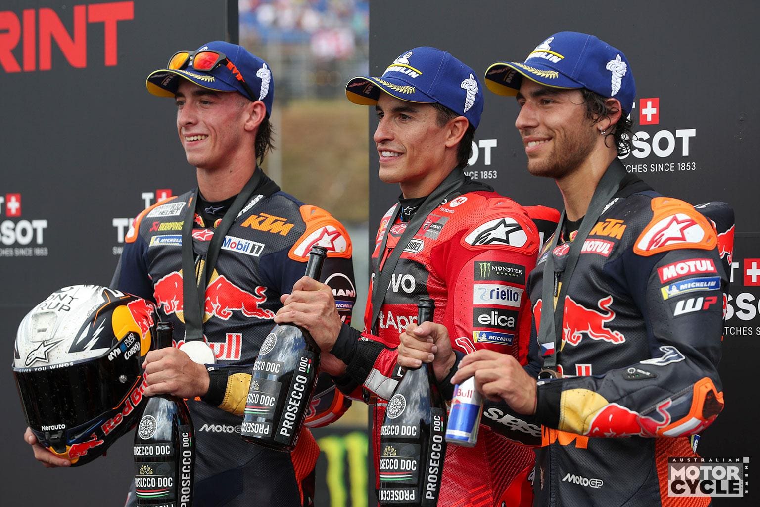 Marquez crossed the line with a 0.5s buffer over Acosta for yet another Sprint triumph. Bastianini finished in third—a heroic effort given just over a week ago he was recovering from a severe stomach bug, apparently losing 3kg body weight in the process. KTM celebrated the double-podium in front of their newly appointed CEO Gottfried Neumeister, who was in the paddock.