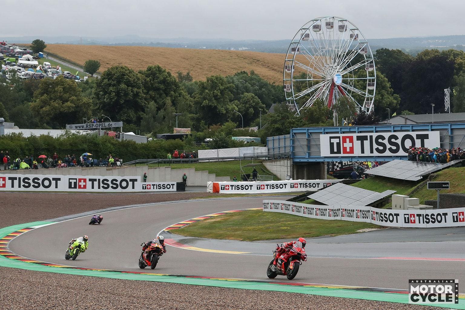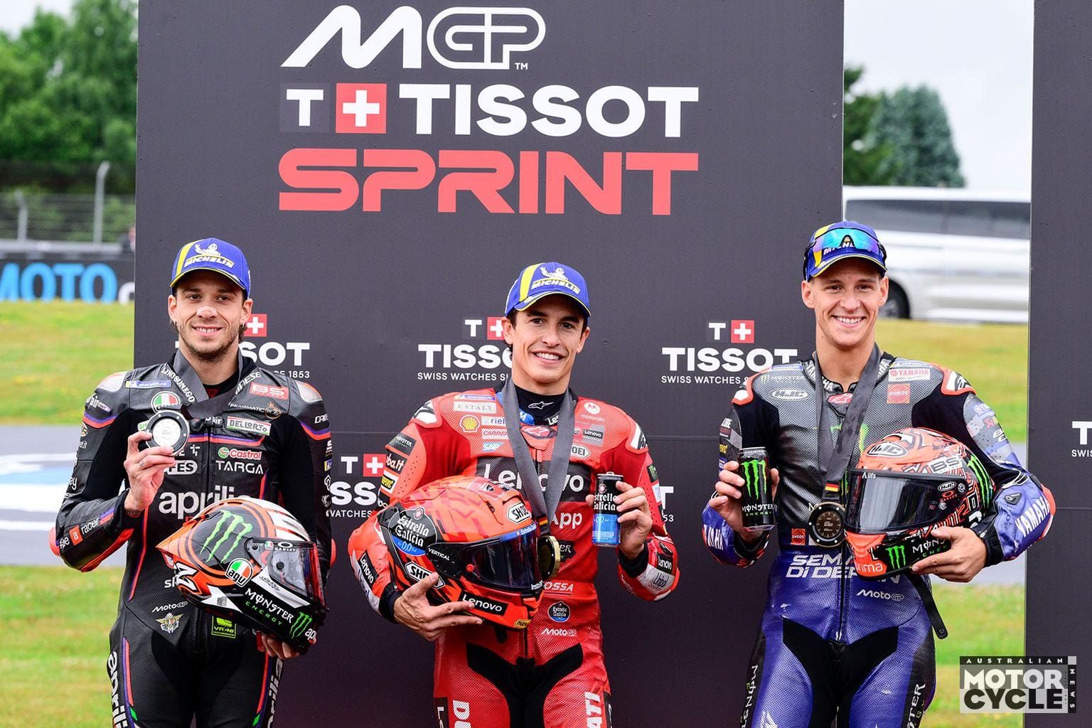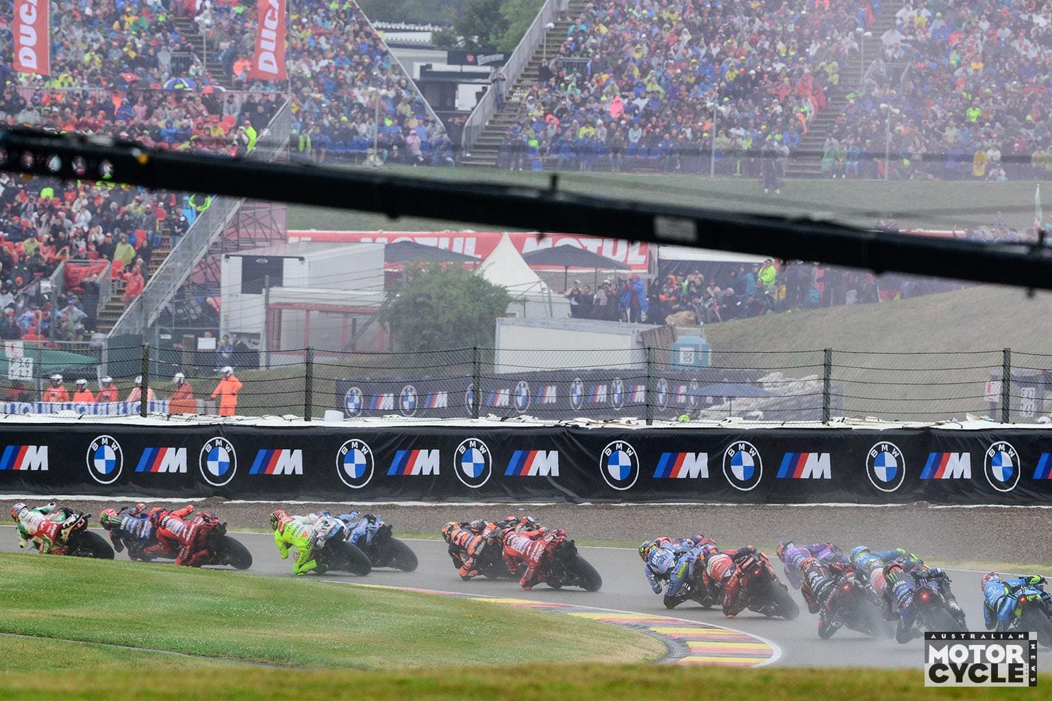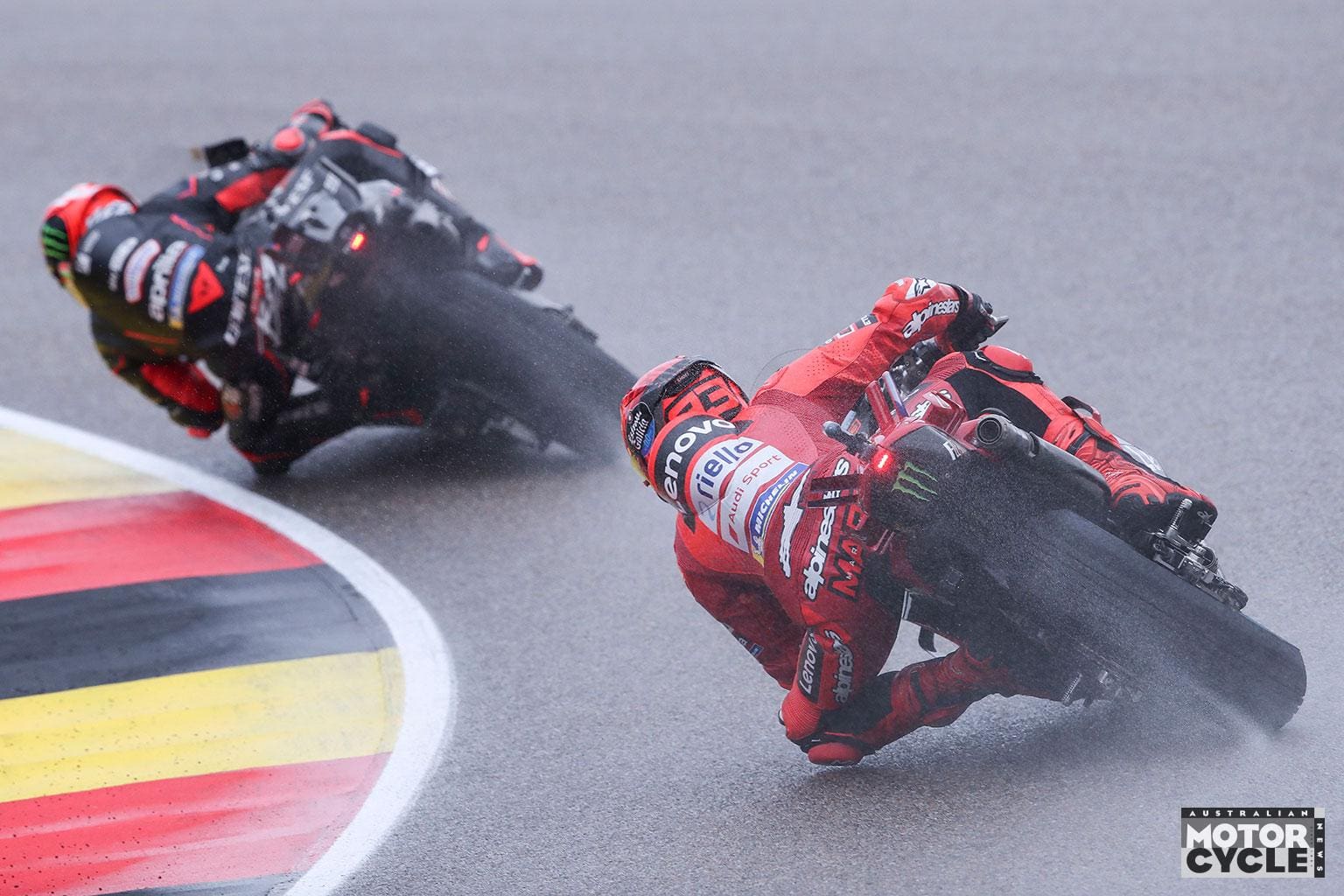 Marc Márquez stunned the Sachsenring faithful once again with a relentless and calculated charge through the field to claim victory in treacherously wet conditions. The reigning championship leader snatched the holeshot off the line but immediately ran wide, dropping himself to fifth and leaving Marco Bezzecchi to slip into the lead ahead of Franco Morbidelli and Fabio Quartararo. Alex Márquez looked strong early, holding sixth, as the opening lap settled into a tense procession of shuffling positions and rising pressure.