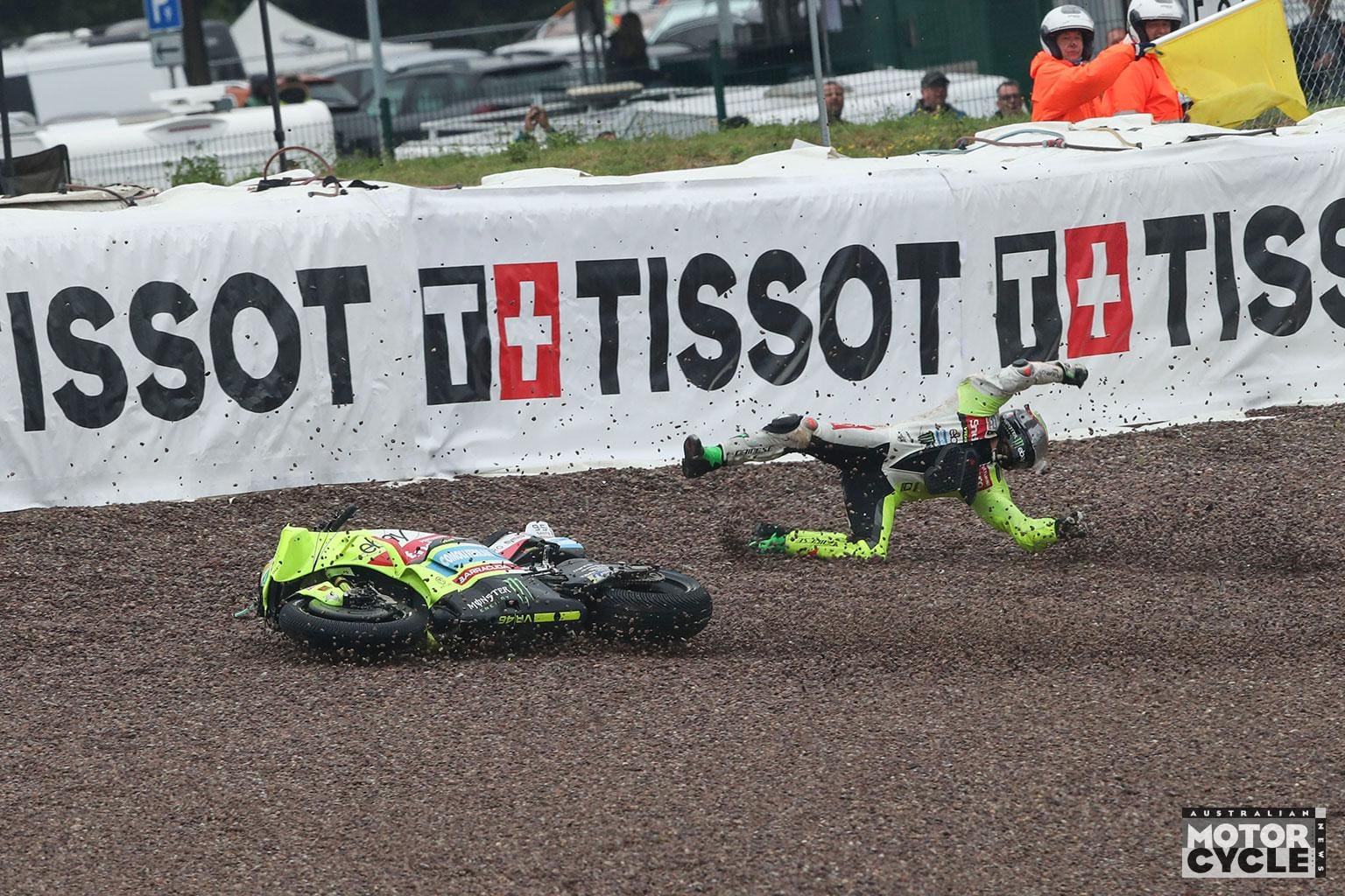 By Turn 1 on lap two, Márquez attempted to dispatch Fabio Di Giannantonio, only for the Italian to cut back and retain fourth. Just behind, Pedro Acosta moved past Alex Márquez into sixth and brought a hungry train of riders with him, while Jack Miller clawed into eighth—typically comfortable in slippery conditions. But the race took a dramatic turn on lap three when Morbidelli crashed hard at Turn 8 while running second, a fast off that left him visibly shaken and out of contention.