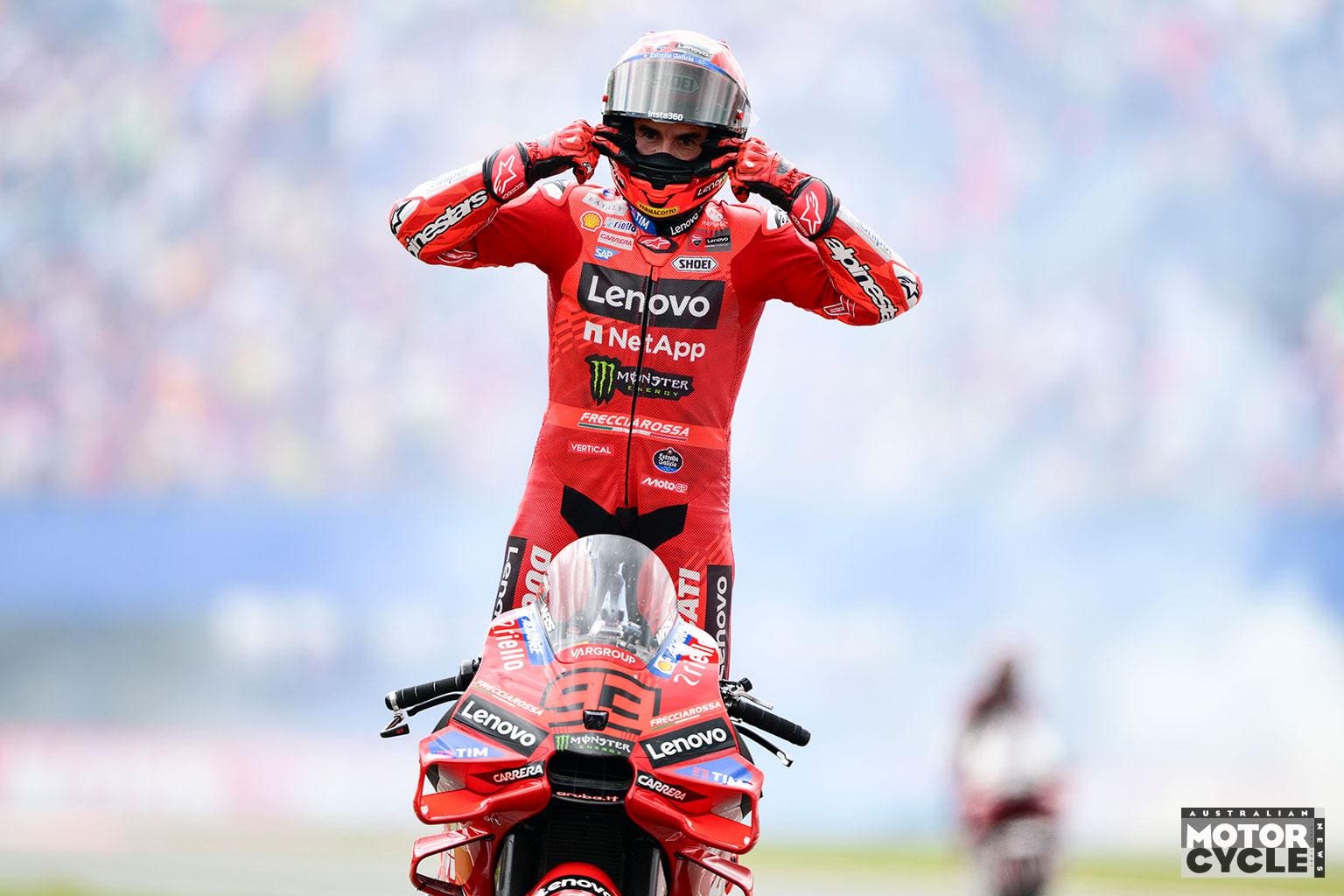 Bezzecchi, looking more comfortable by the lap, became the fastest rider on circuit, but Pedro Acosta was in hot pursuit and the top five bunched up. Marc made the defining move of the race on Bagnaia into the final chicane on Lap 5, braking from a distance with fierce confidence. Bagnaia tried to counter straight back, but Marc’s faith in the front end of his Ducati meant no gap was available.