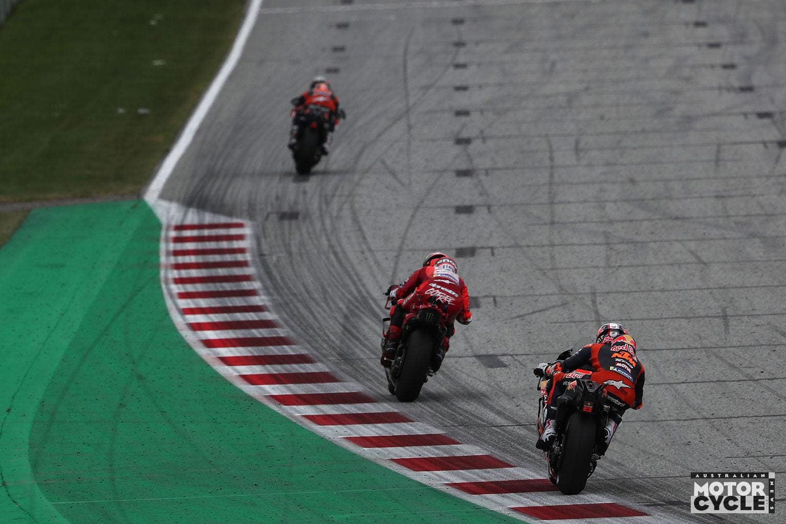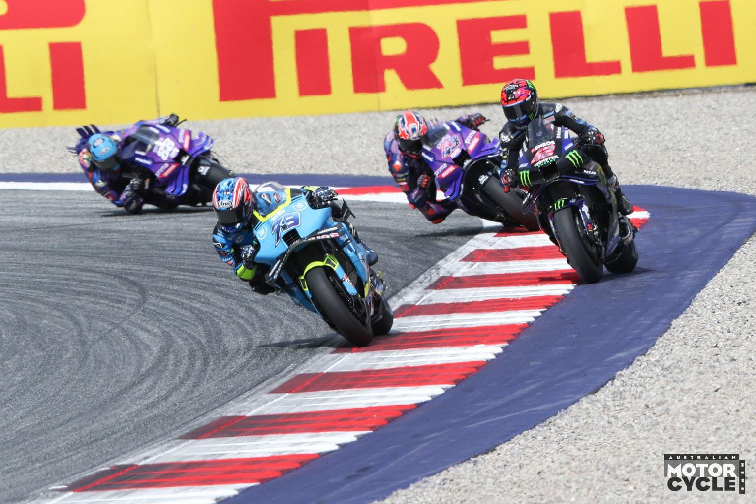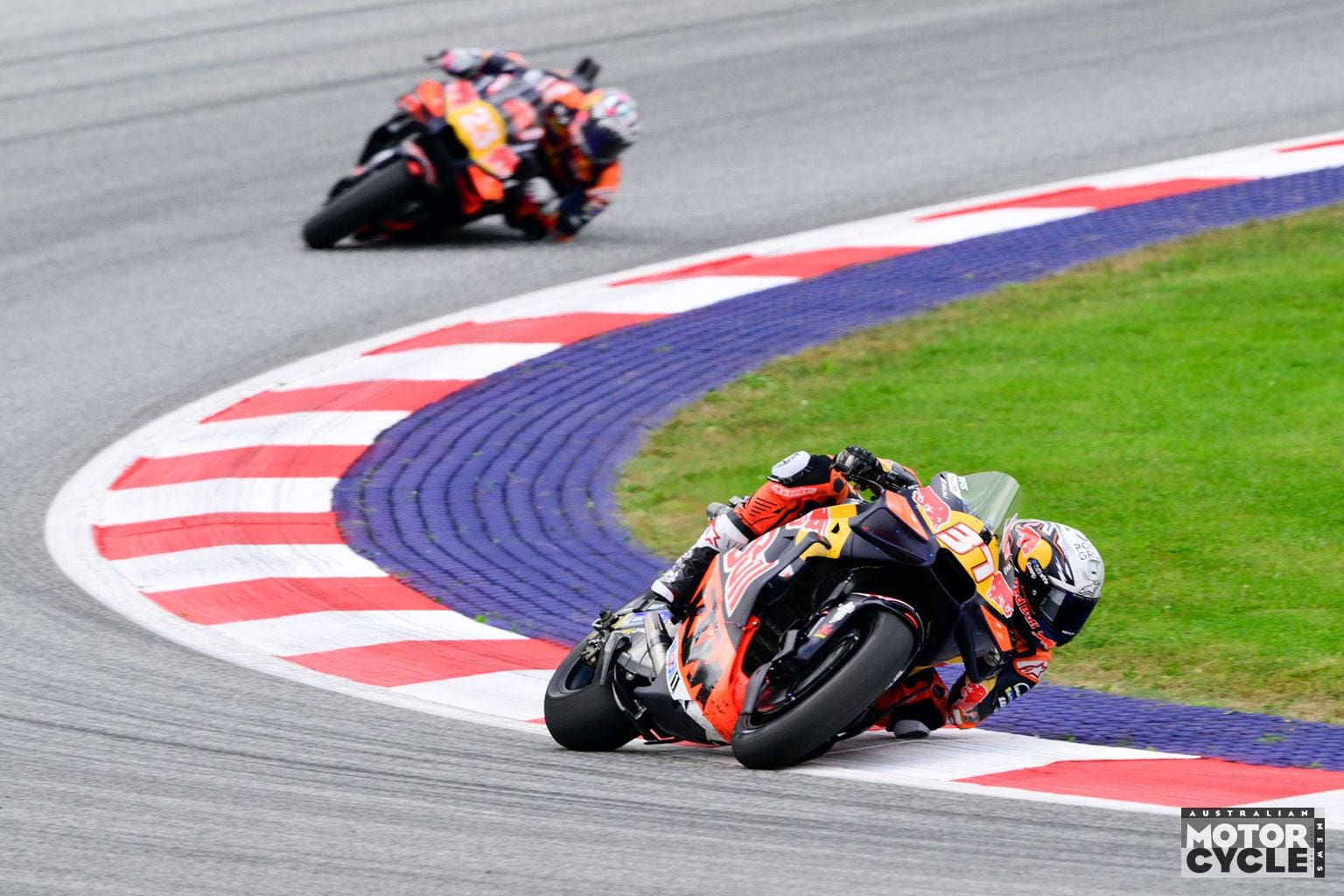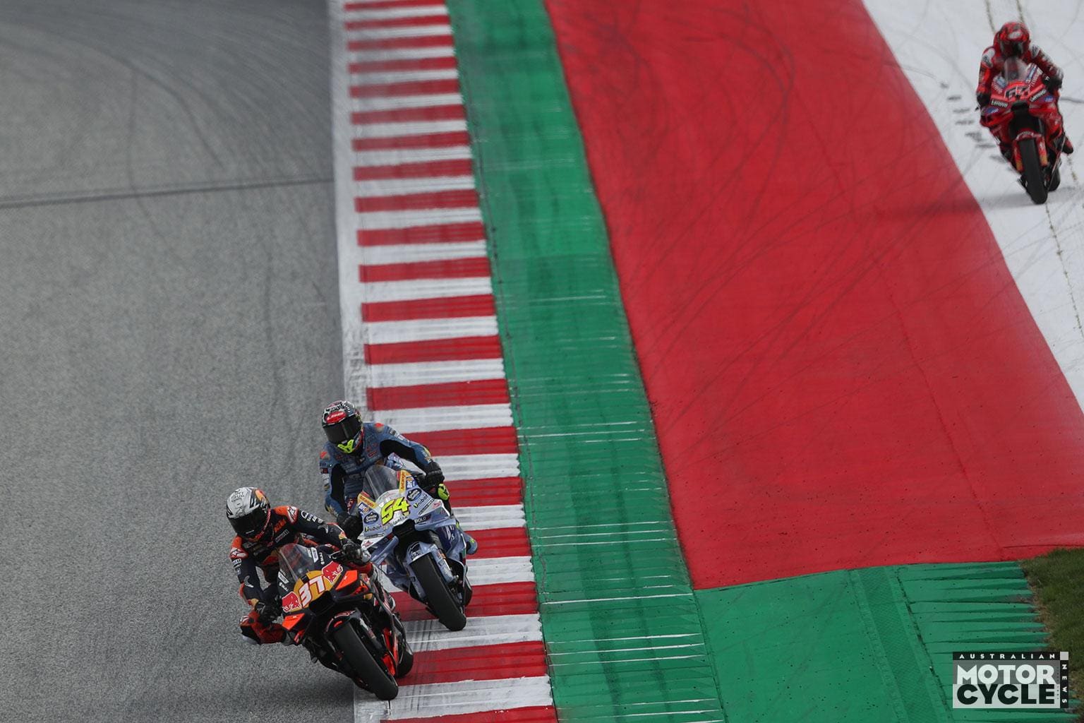 At mid-distance Marquez latched onto Bezzecchi’s rear tyre, but the Aprilia’s punch off the slow corners kept the door closed into Turn 3. Bezzecchi then eked out another 0.75 seconds as Marc bided his time. Jorge Martin’s GP ended in the gravel with a Turn 7 low-side, while Bastianini literally slid his KTM up the inside of Raul Fernandez with a spectacular braking pass into Turn 1.